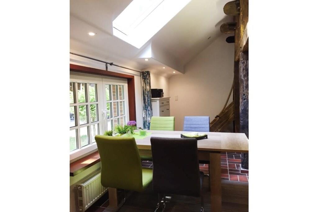 Die 4-Sterne (DTV)-Wohnung befindet sich im historischen Heuerhaus mit frei liegendem Ständerwerk und antikem Kamin in idyllischer Außenbereichslage. Der Wohnbereich mit Küchenzeile und Gäste-Toilette der Wohnung befindet sich im Erdgeschoss mit Blick auf den Bauerngarten. Der Schlafbereich ( 4 Betten und eine Schlafcouch) mit Bad im Obergeschoss mit Blick auf den Bauerngarten und den traumhaften Rhododendrongarten. Das vordere Wohn/Schlafzimmer ist Durchgangszimmer zu Bad und Schlafzimmer. Zur Wohnung Gartenblick gibt es 2 Verbindungstüren, sodass bei Bedarf die beiden Wohnungen als Einheit gebucht werden können. Von charaktervollen Laubbäumen umrahmtes Grundstück in landschaftlich ruhiger Lage. Ein Blütenparadies, insbesondere aufgrund des alten wertvollen Rhododendronbestandes. 20 wertvolle Mammutbäume (Sequoias) grenzen den Garten nach Westen hin ein. Auf dem Gartengrundstück mit einem idyllischen Bauerngarten befinden sich der Bungalow mit Anbau. Ein ehemaliges Heuerhaus, historische Remise (ehem. Torfschuppen), Brunnen, Backhaus, Schwimmbad und Sauna . Stromversorgung über eine PV-Anlage und Stromspeicher. Der Kamin kann kostenfrei genutzt werden. Sauna bedingt nach Corona Regeln nutzbar und Pool bis ca. Dezember 2021 geschlossen.