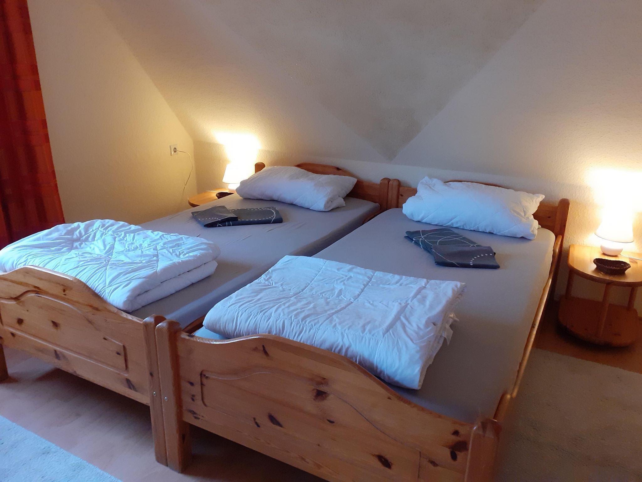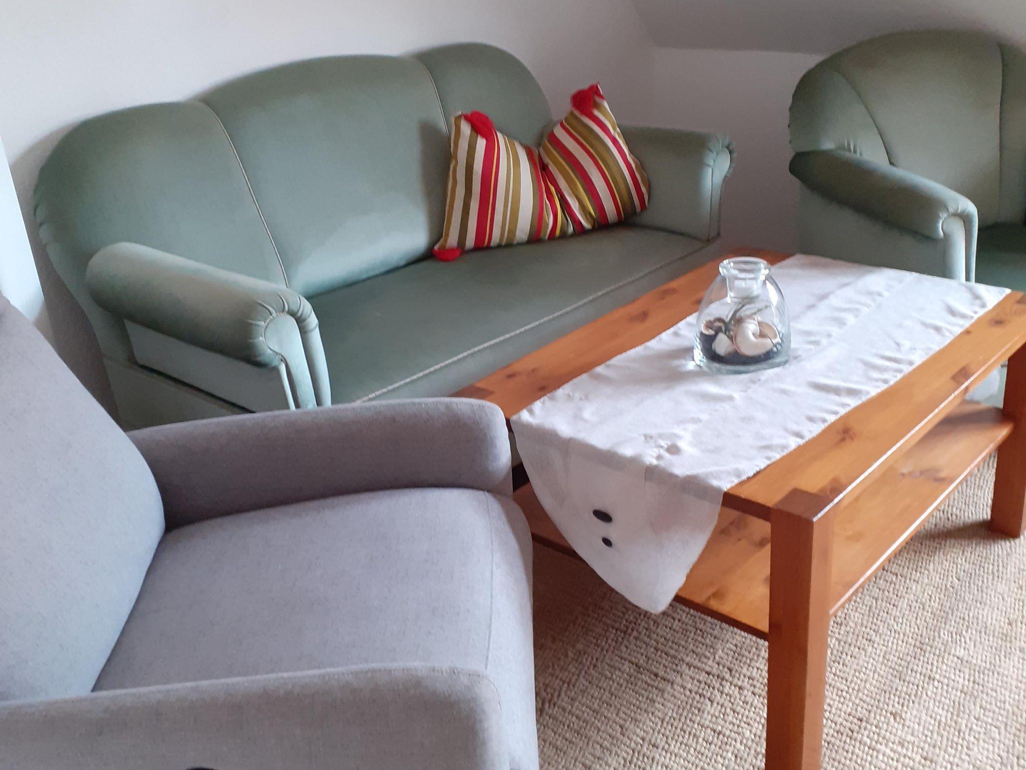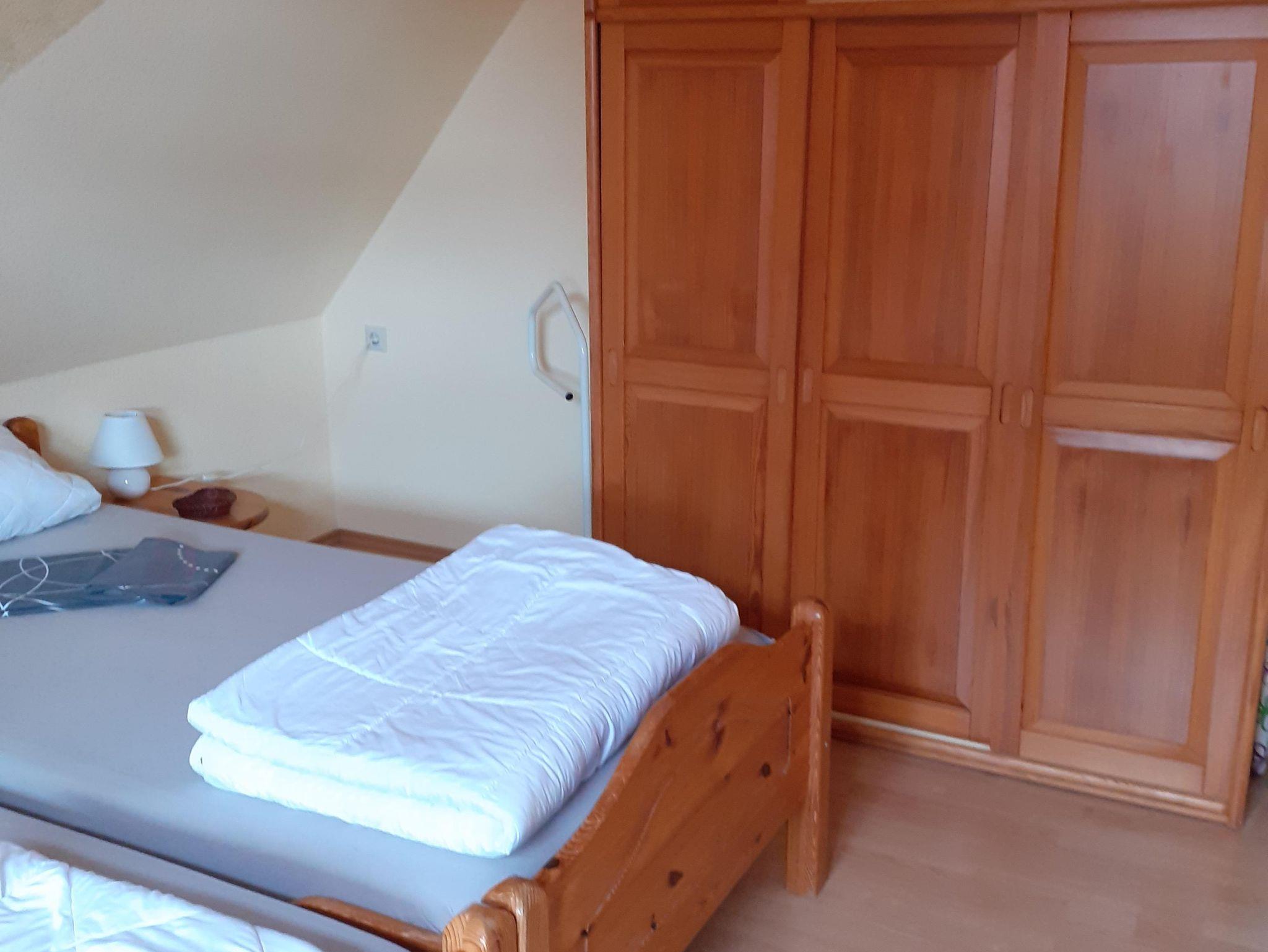 Die gemütliche und komfortable Ferienwohnung ist im Obergeschoss des Hauses. Sie ist komplett eingerichtet und verfügt über einen separaten Eingang. Auf insgesamt 50 qm Wohnfläche gehören 1 Wohnzimmer, 2 Schlafzimmer sowie Küche und Dusche/WC zu ihrem ganz persönlichen Bereich. Eine Mikrowelle, Geschirrspüler,Waschtrockner, Kaffeemaschine etc., Radio und Satelliten-TV sorgen für Komfort und Unterhaltung. Handtücher und Bettwäsche werden selbstverständlich gestellt. Für selbstmitgebrachte Gegenstände wird keine Haftung übernommen!