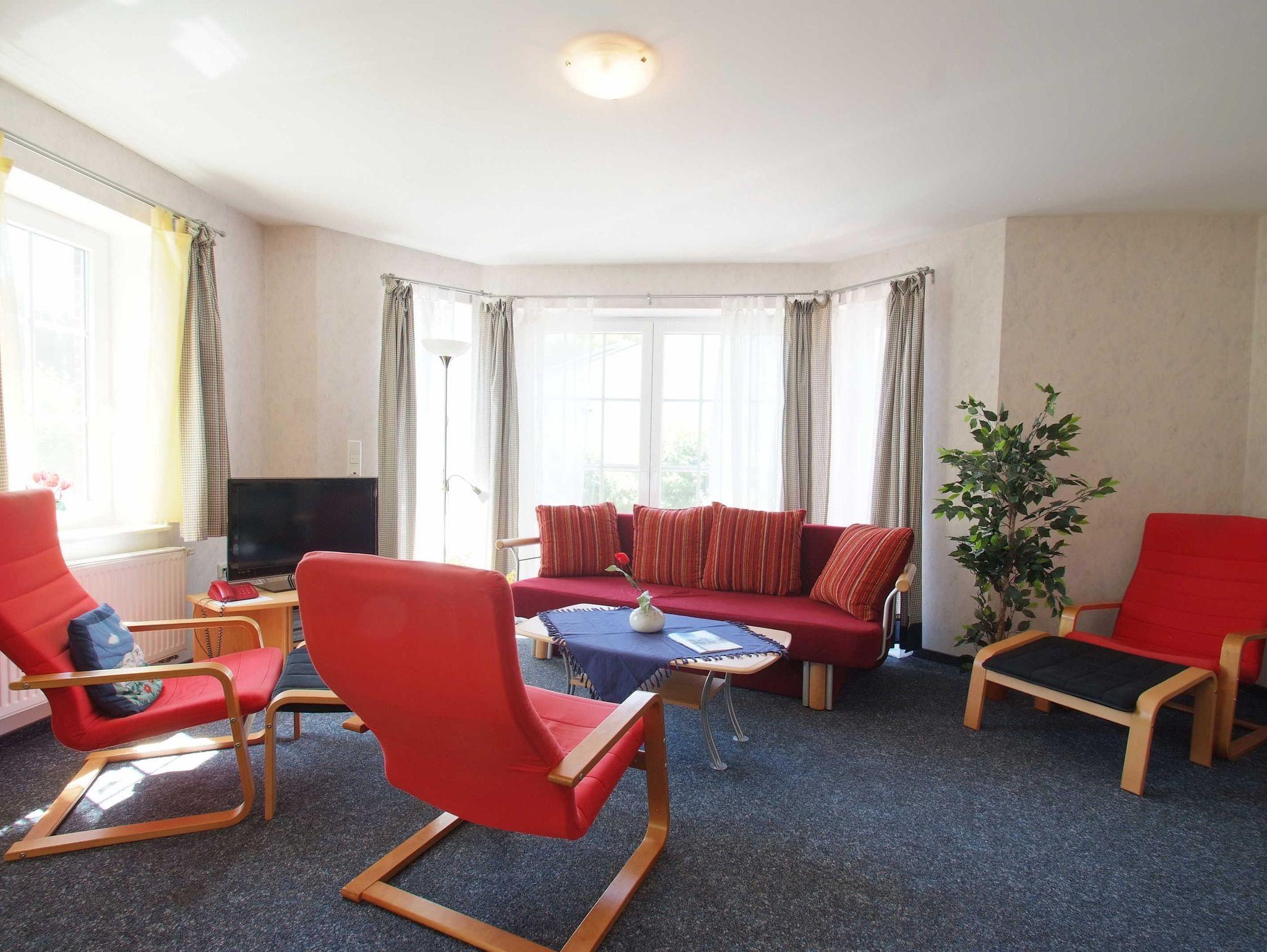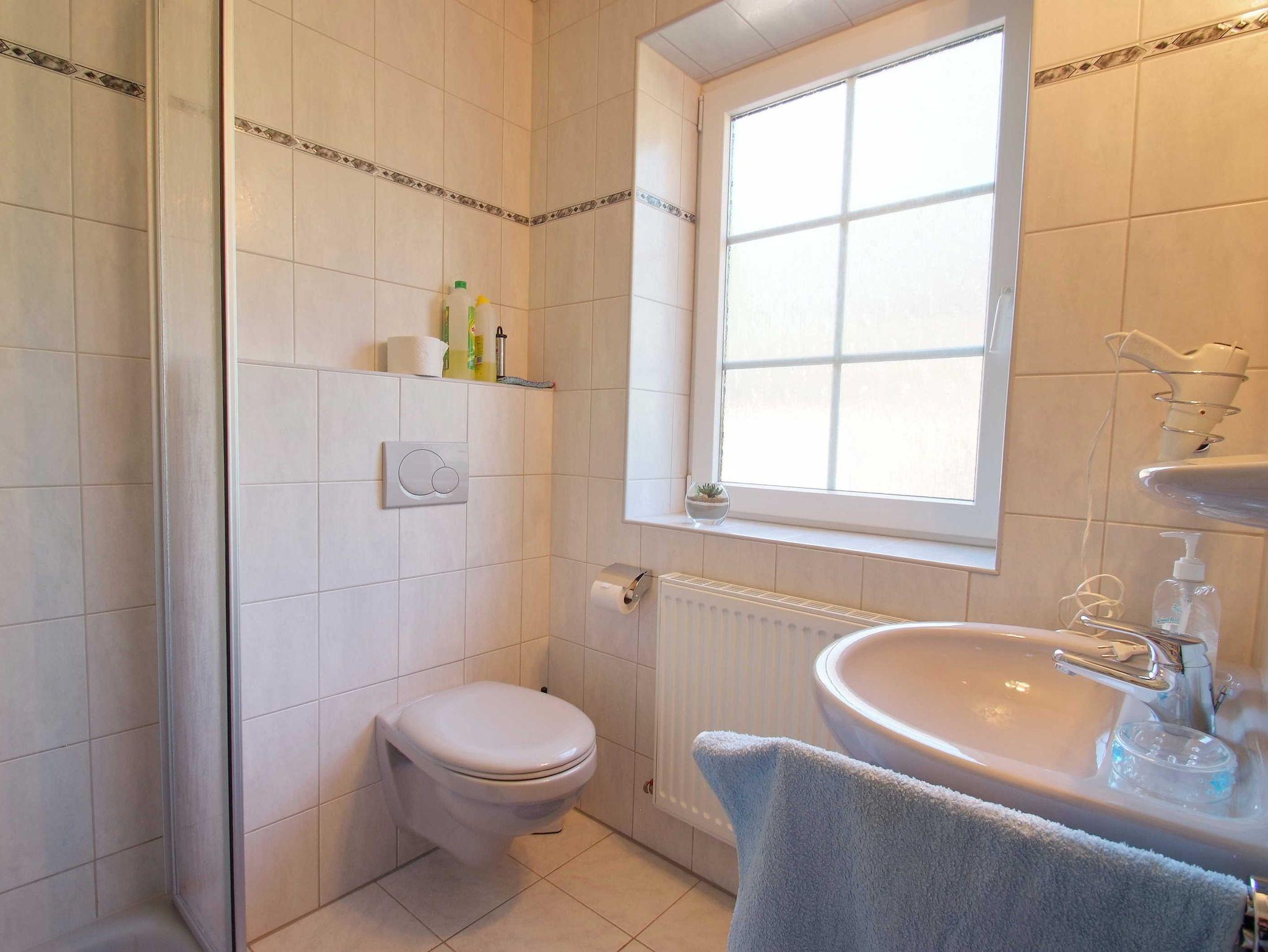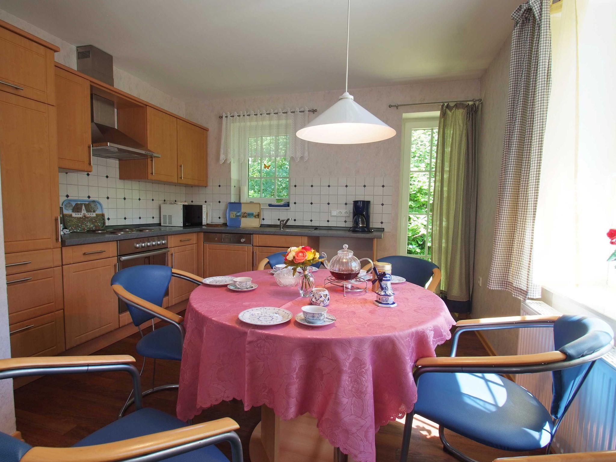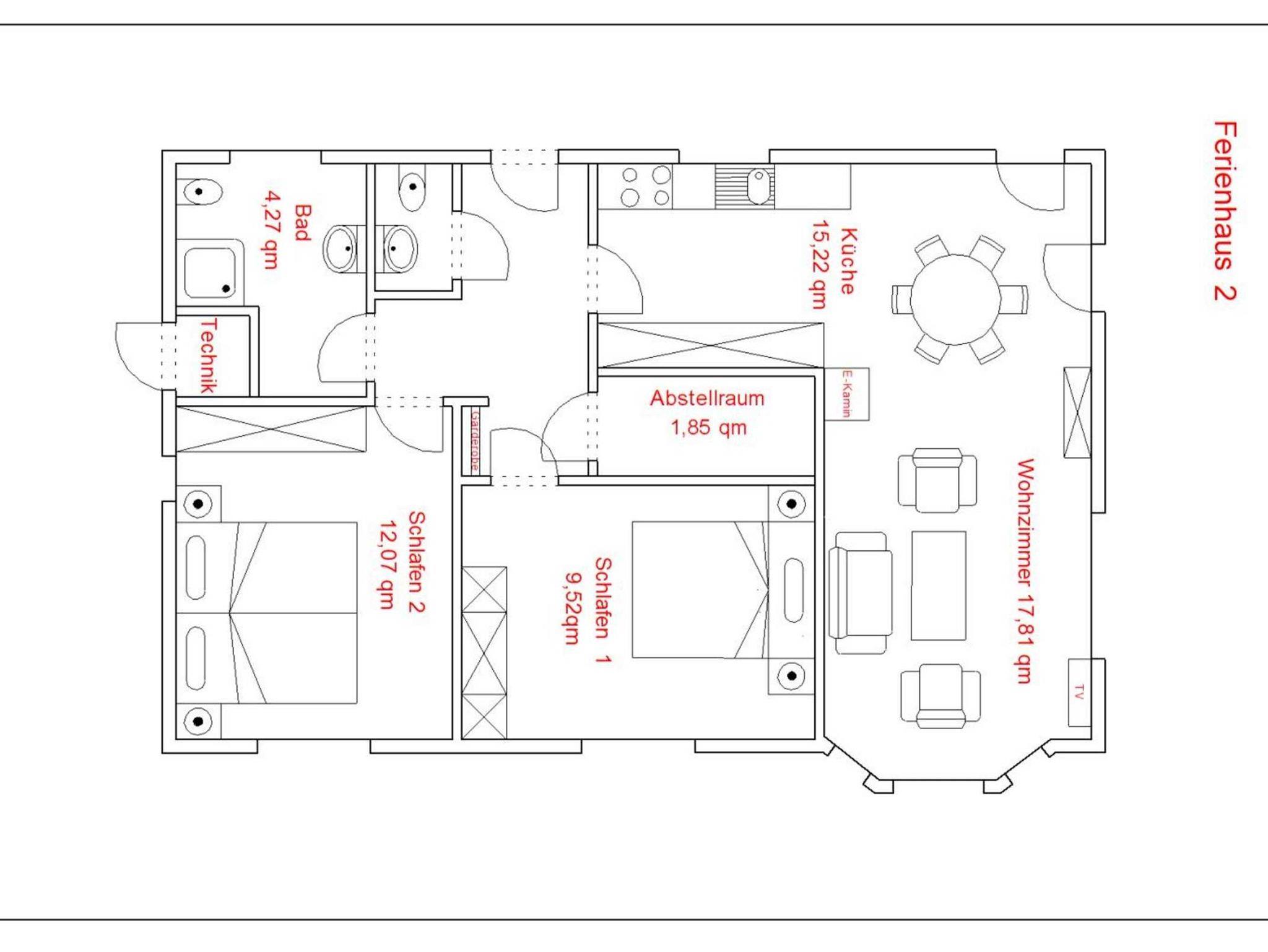 Bad mit Dusche und WC. Separates WC. Schlafzimmer mit Ehebett ,großem Kleiderschrank. Schlafzimmer mit einem 140 cm breitem Bett, Kleiderschrank. Wohnzimmer mit Doppelschlafsofa und 2 Fernsehsesseln. Babybett auf Anfrage. Offene Küche mit Geschirrspüler und Gefrierbox. Esstisch. Großer Abstellraum. Fliegengitter. Bettwäsche, Handtücher, Endreinigung inkl. Terrasse mit Möbeln, Grill und abschließbarer Hütte für Fahrräder etc. E-Rad-Lademöglichkeit.. 1 Parkplatz mit E-Ladestation direkt an Haustür.