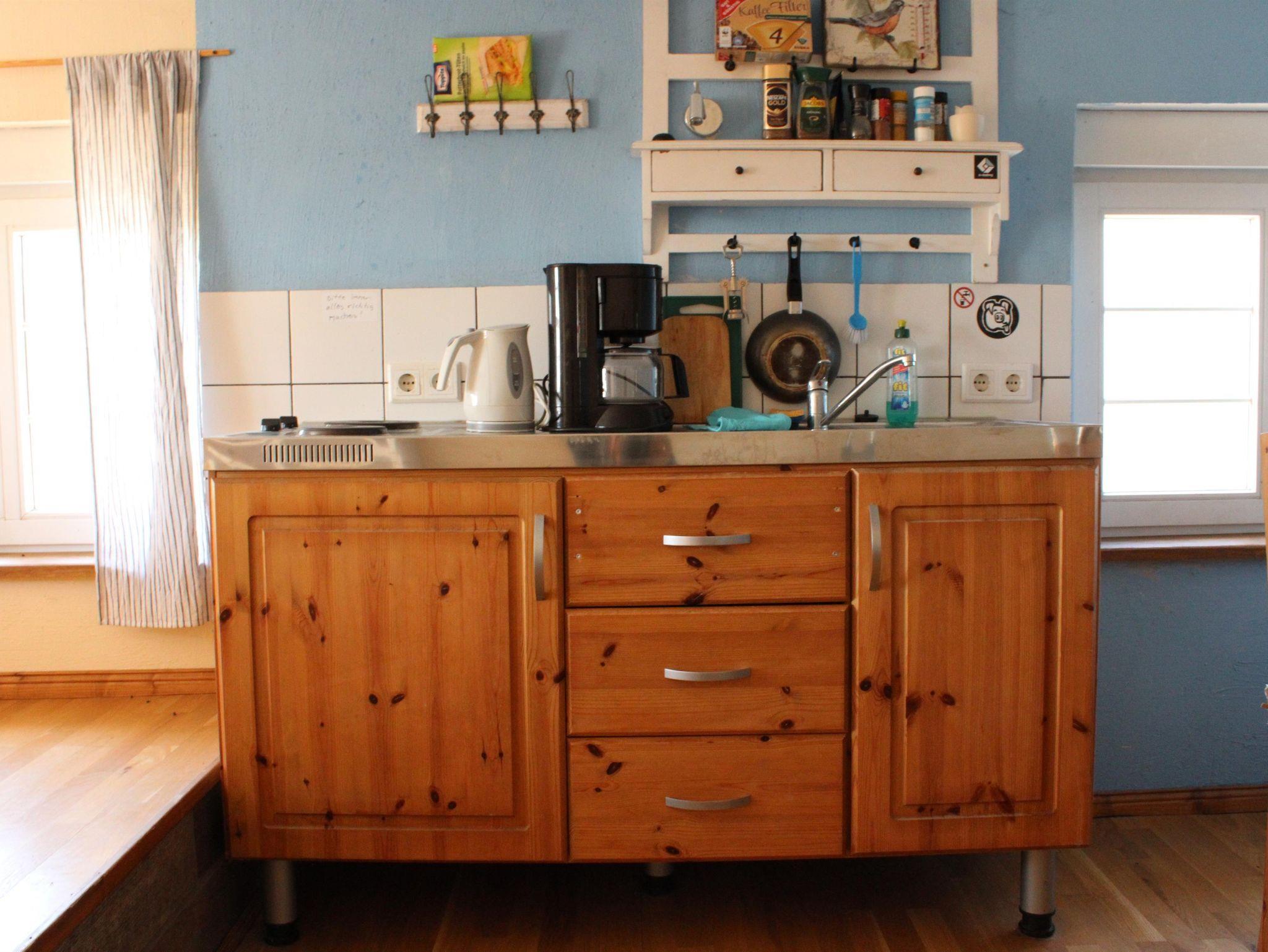 Die Wohnung verfügt über einen gemütlichen Wohn- und Schlafbereich, der funktional und komfortabel gestaltet ist. Die integrierte Kochnische ist mit einem Elektroherd, einem Geschirrspülbecken, einem Kühlschrank sowie einer Kaffeemaschine ausgestattet und bietet dir optimale Möglichkeiten zur Selbstversorgung. Ein Radio sorgt zusätzlich für Unterhaltung und eine angenehme Atmosphäre.