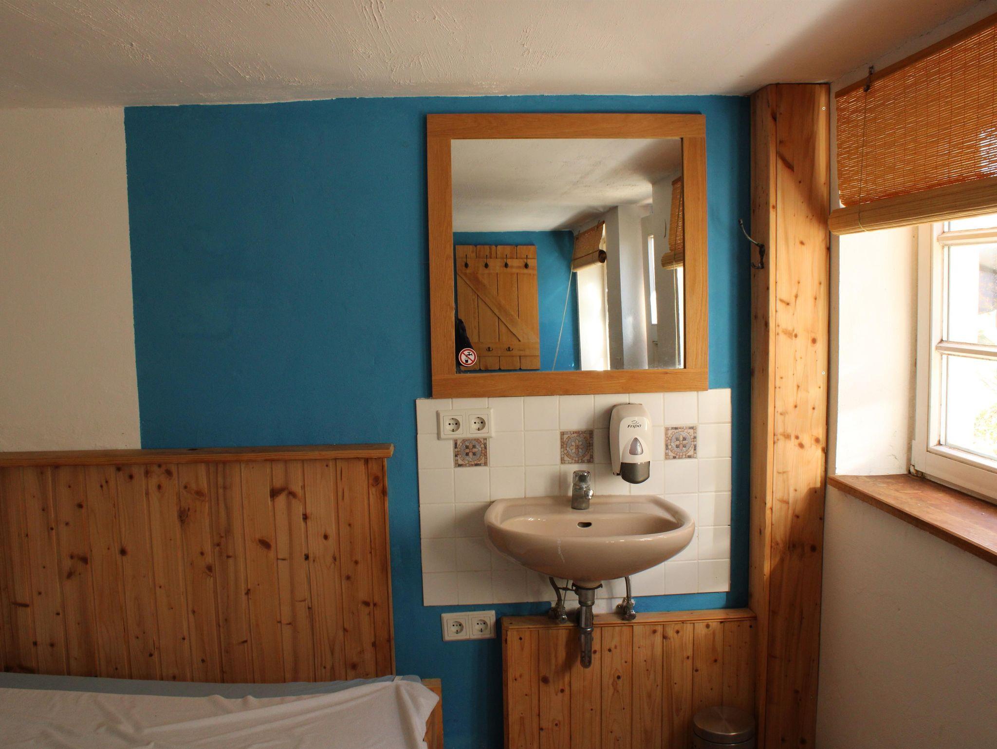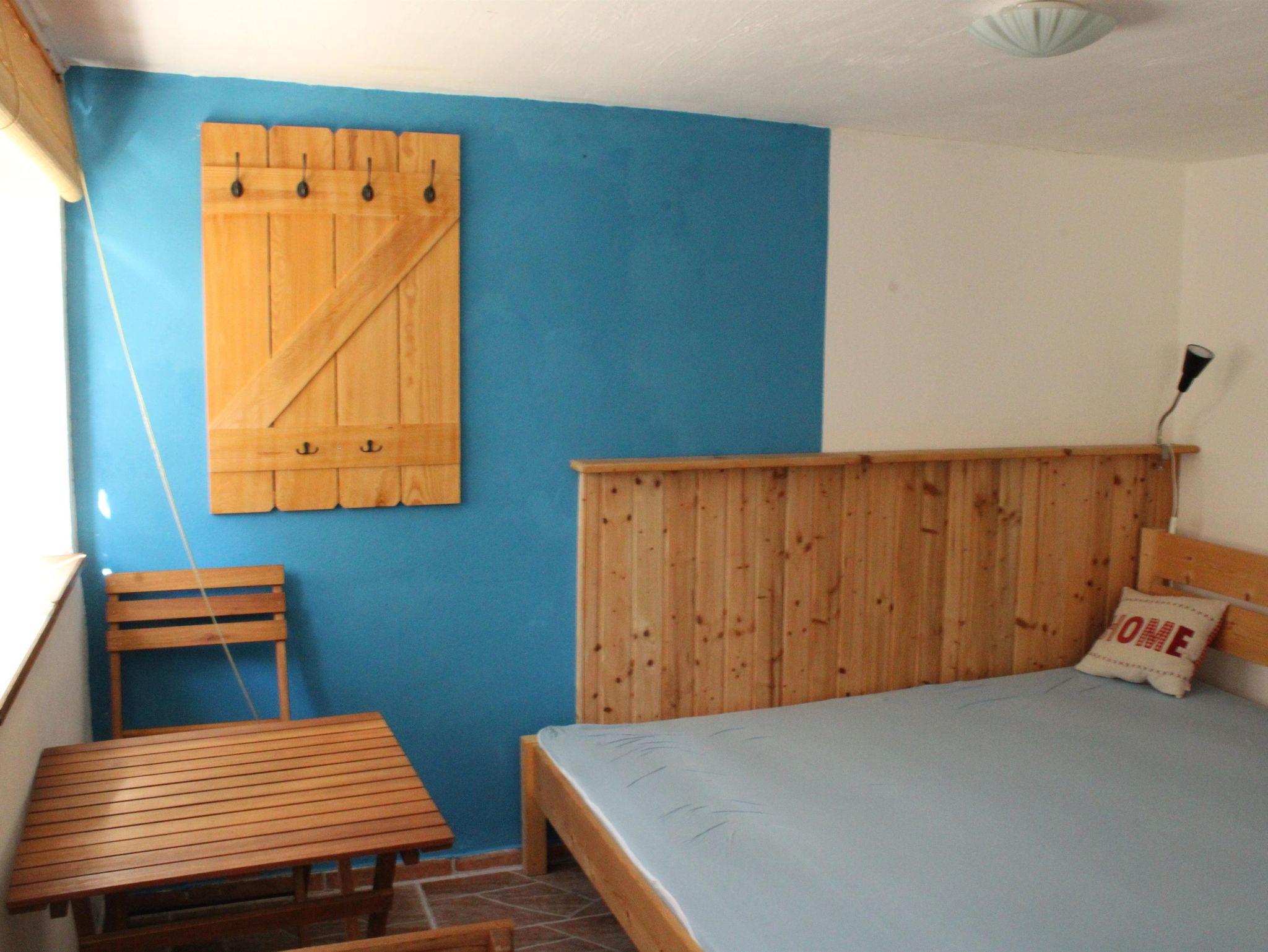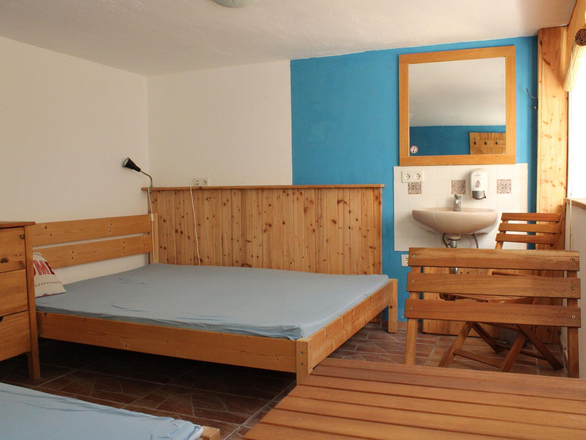 Das Gästezimmer verfügt über zwei Doppelbetten und bietet damit ausreichend Platz für mehrere Personen. Die einfache, funktionale Möblierung sorgt für eine angenehme und entspannte Atmosphäre. Ein eigener Waschtisch mit fließendem Kalt- und Warmwasser sowie ein separates WC befinden sich direkt im Zimmer. Die Sanitäreinrichtungen des Campingplatzes stehen zusätzlich zur Nutzung bereit.