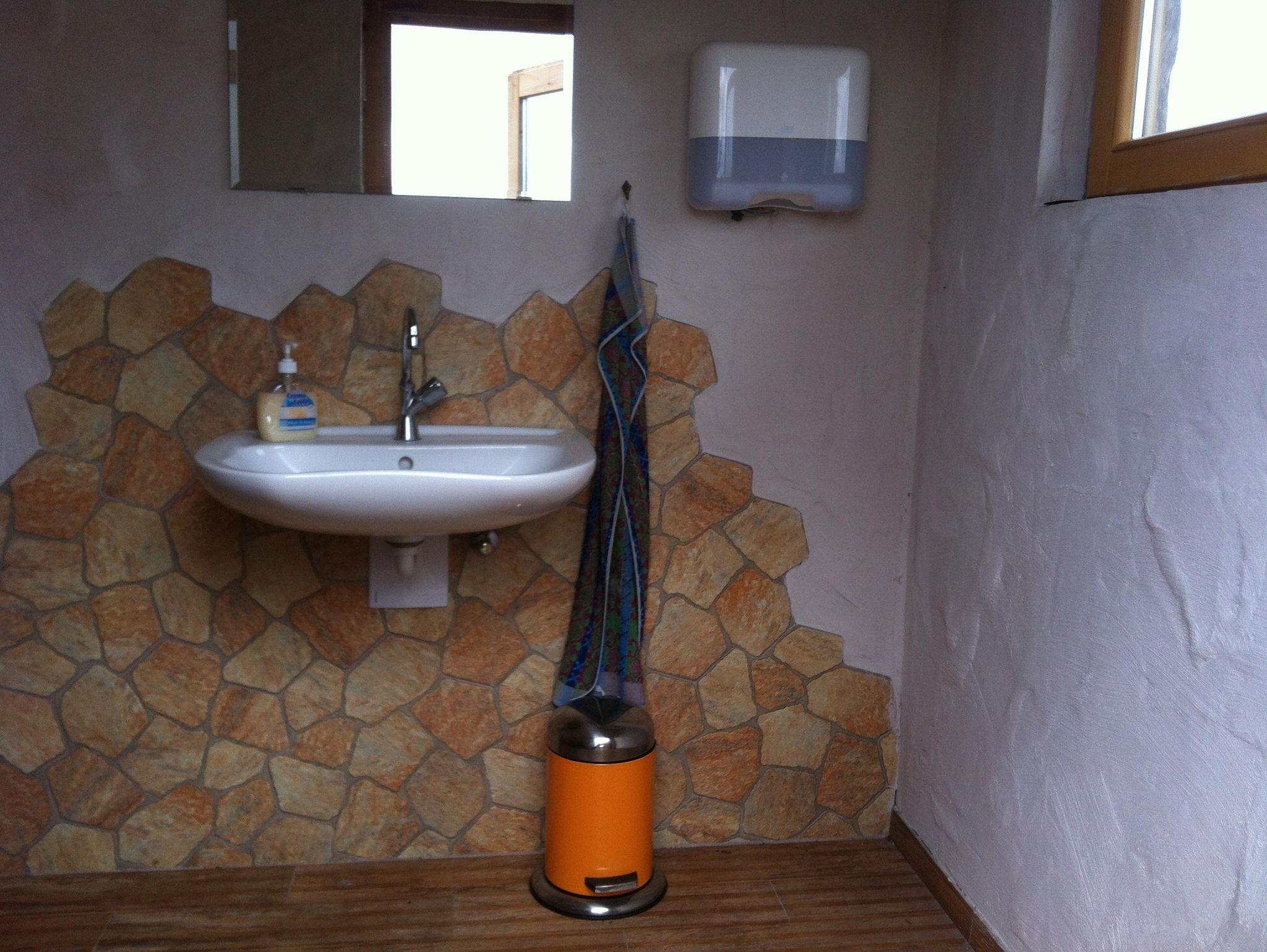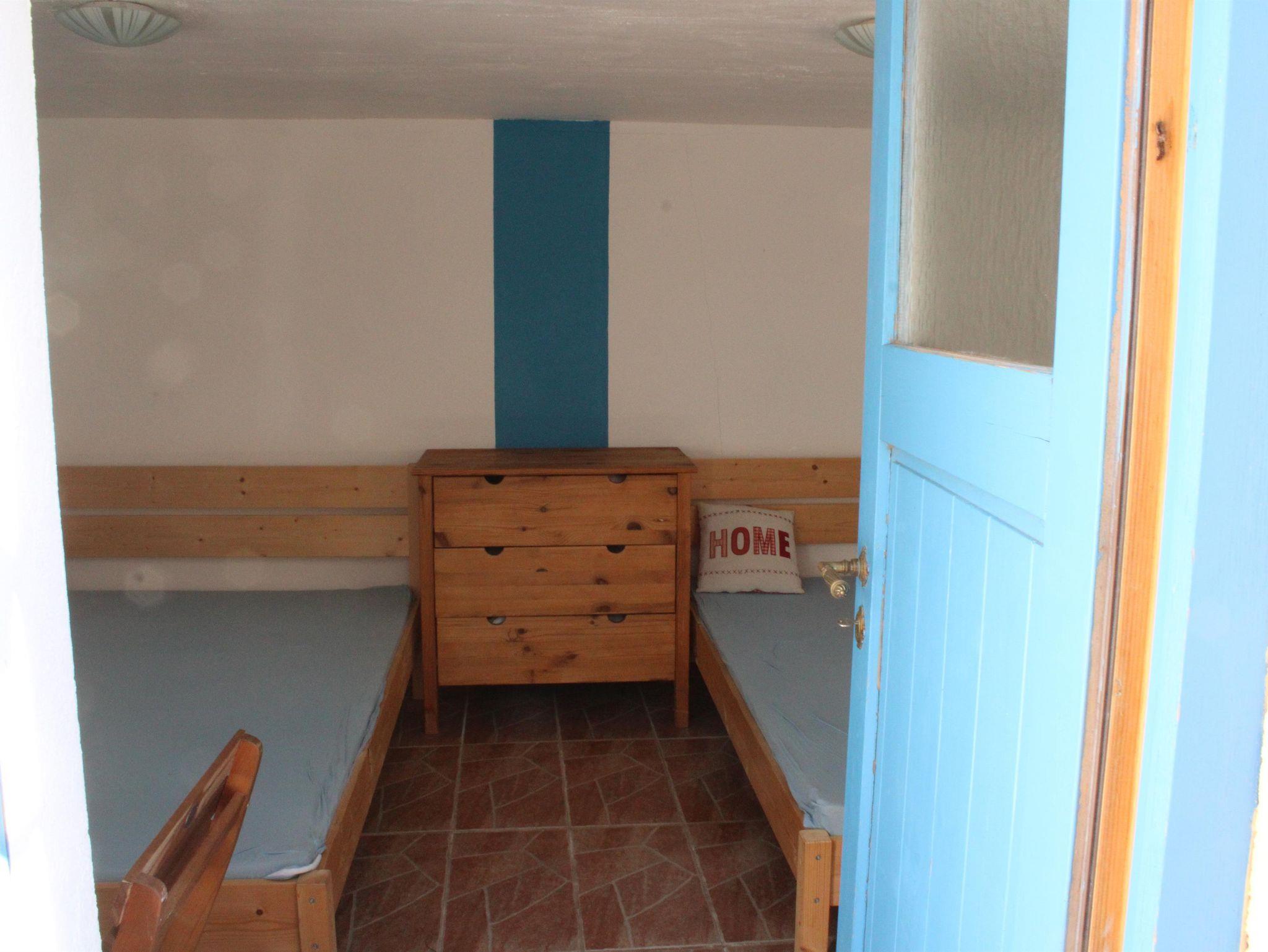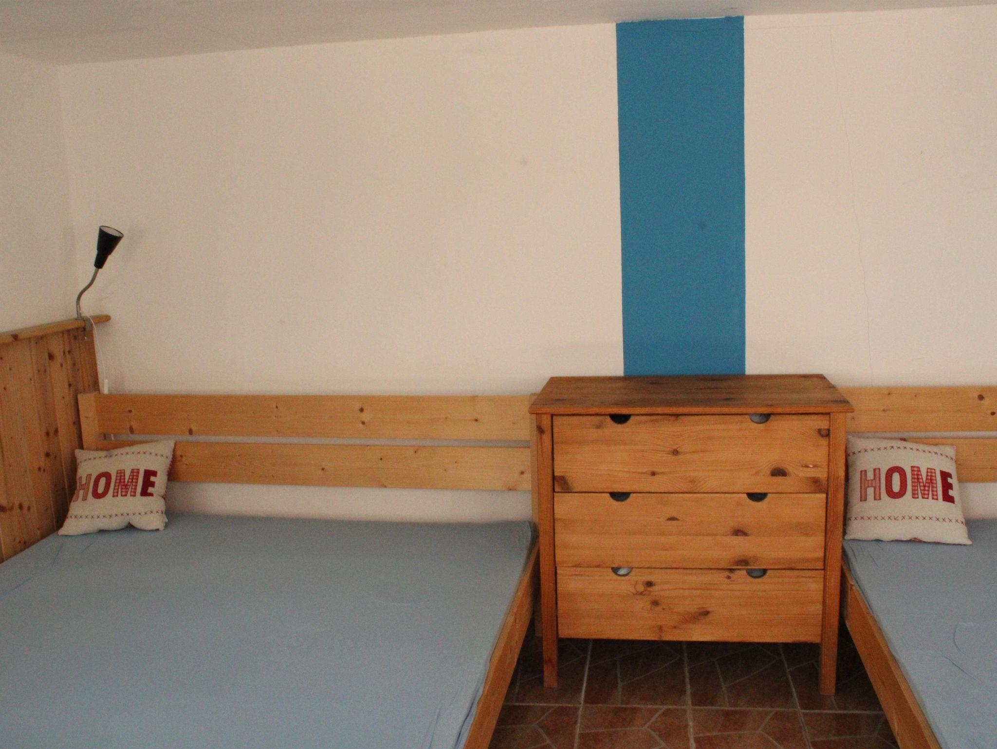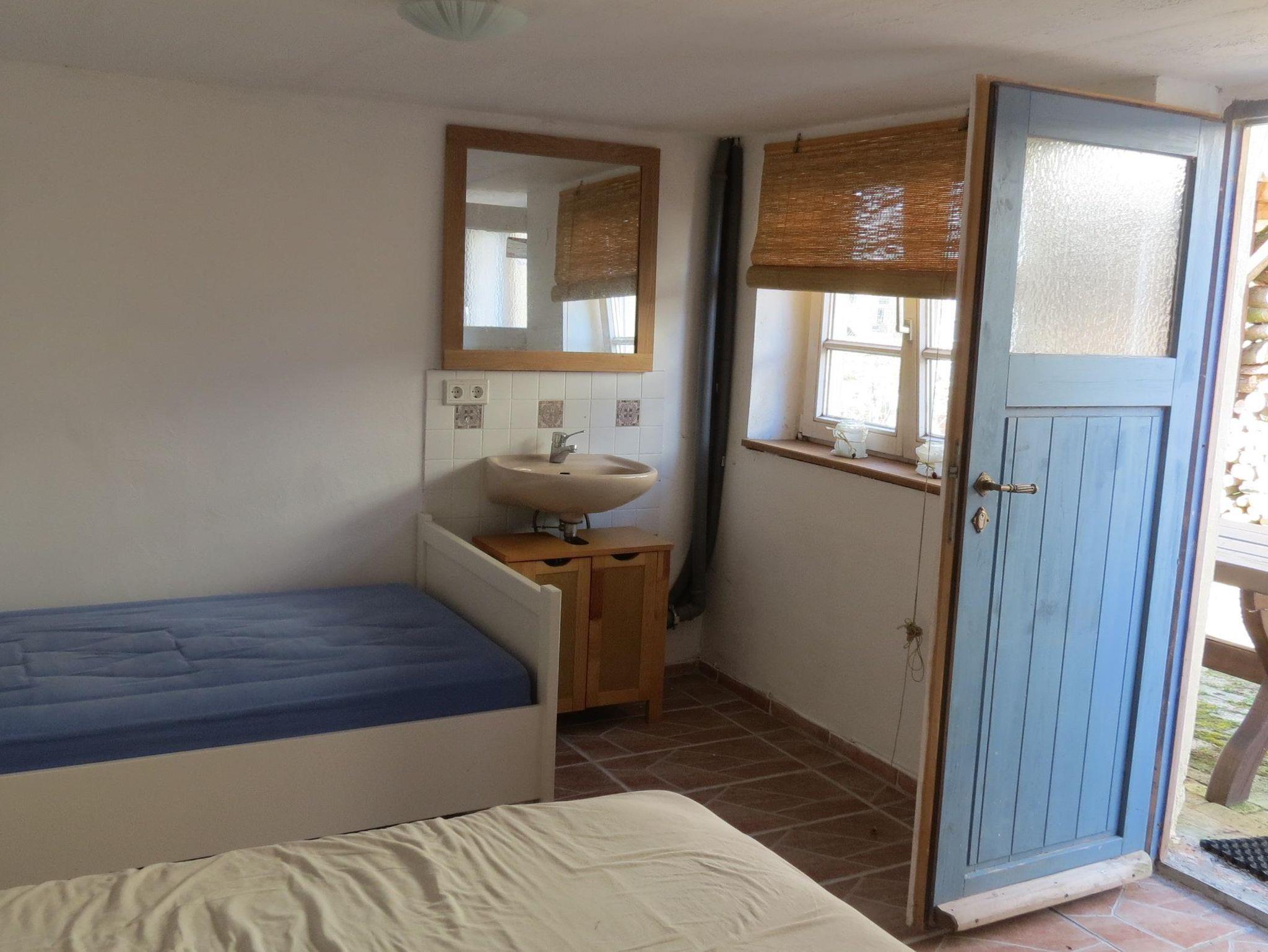 Das Gästezimmer verfügt über zwei Doppelbetten und bietet damit ausreichend Platz für mehrere Personen. Die einfache, funktionale Möblierung sorgt für eine angenehme und entspannte Atmosphäre. Ein eigener Waschtisch mit fließendem Kalt- und Warmwasser sowie ein separates WC befinden sich direkt im Zimmer. Die Sanitäreinrichtungen des Campingplatzes stehen zusätzlich zur Nutzung bereit.