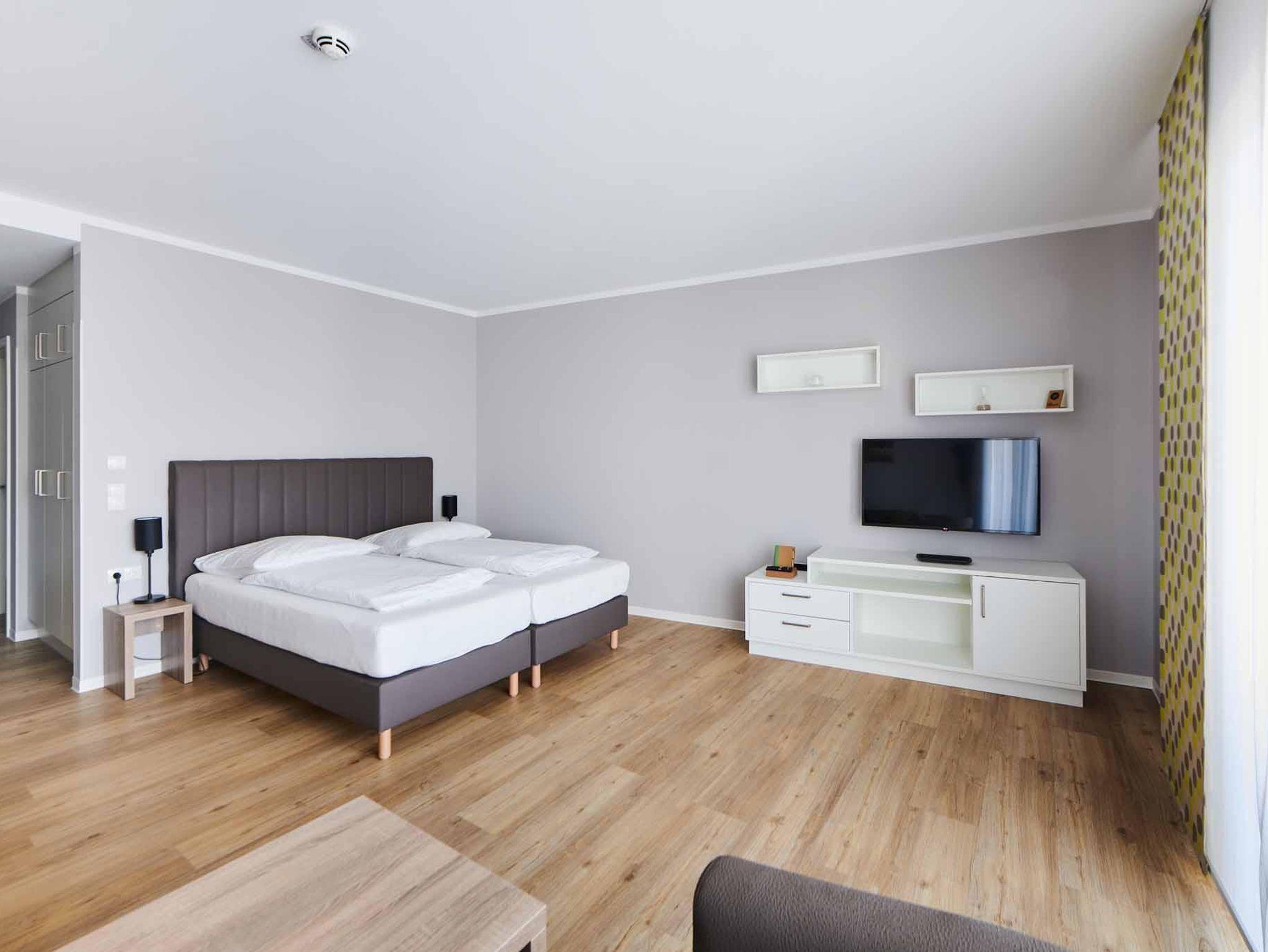 Unsere drei großzügig geschnittenen Einzel- und Doppel-Apartments der Größe M mit 45 qm vereinen stilvolles Design mit durchdachtem Komfort – ideal für gehobenes Wohnen auf Zeit. Die großen Glasfronten und die private Terrasse lassen viel Tageslicht herein und schaffen ein offenes, einladendes Ambiente. Jedes Apartment bietet eine voll ausgestattete Küche, ein modernes Bad, reichlich Stauraum und eine hochwertige Ausstattung, die keine Wünsche offenlässt. Für zusätzlichen Komfort sorgen kostenfreie Waschmaschinen und Trockner im Gebäude, kostenloser Kaffee sowie schnelles WLAN – alles, was Sie für ein angenehmes und unabhängiges Wohnerlebnis benötigen.