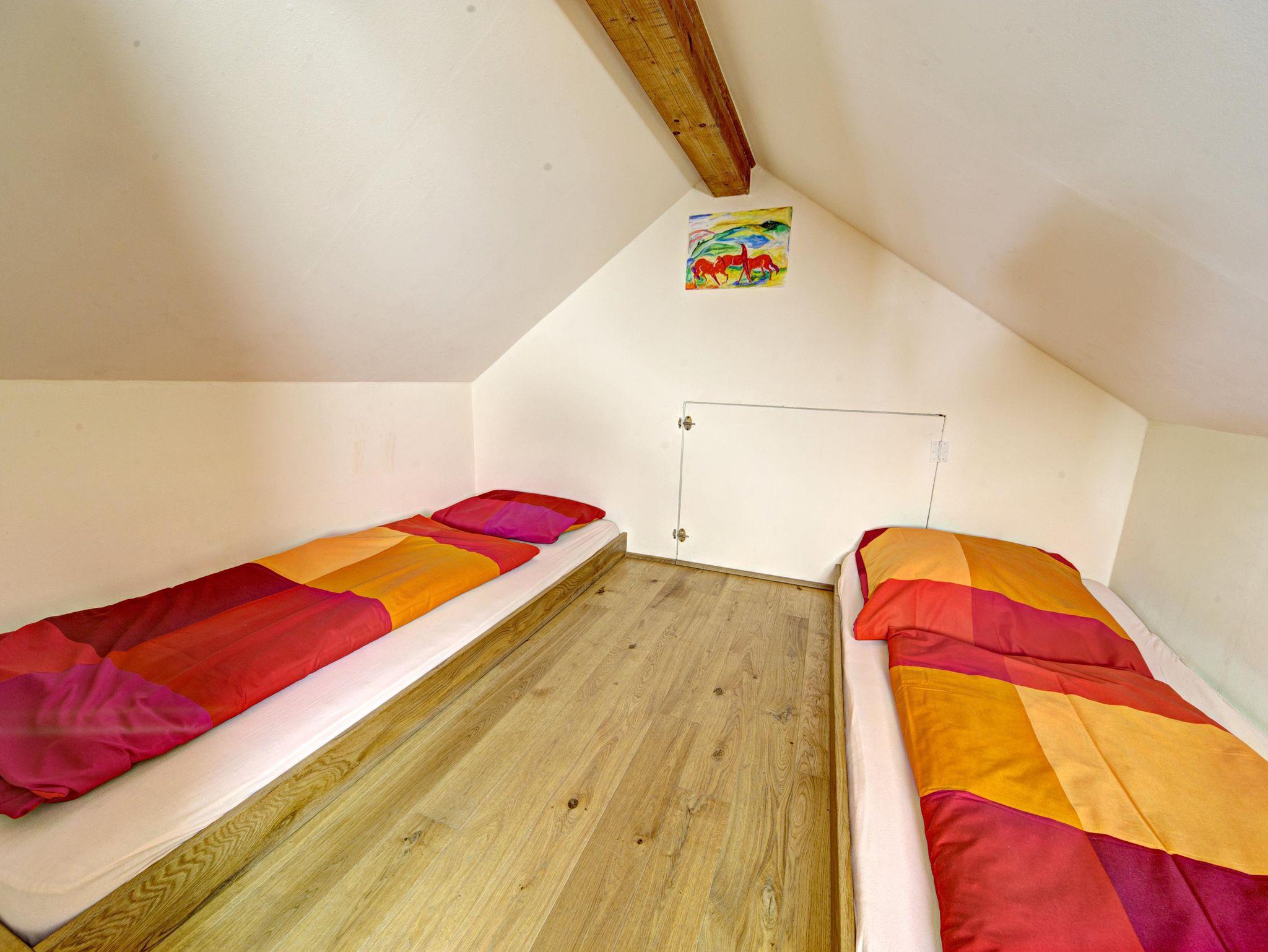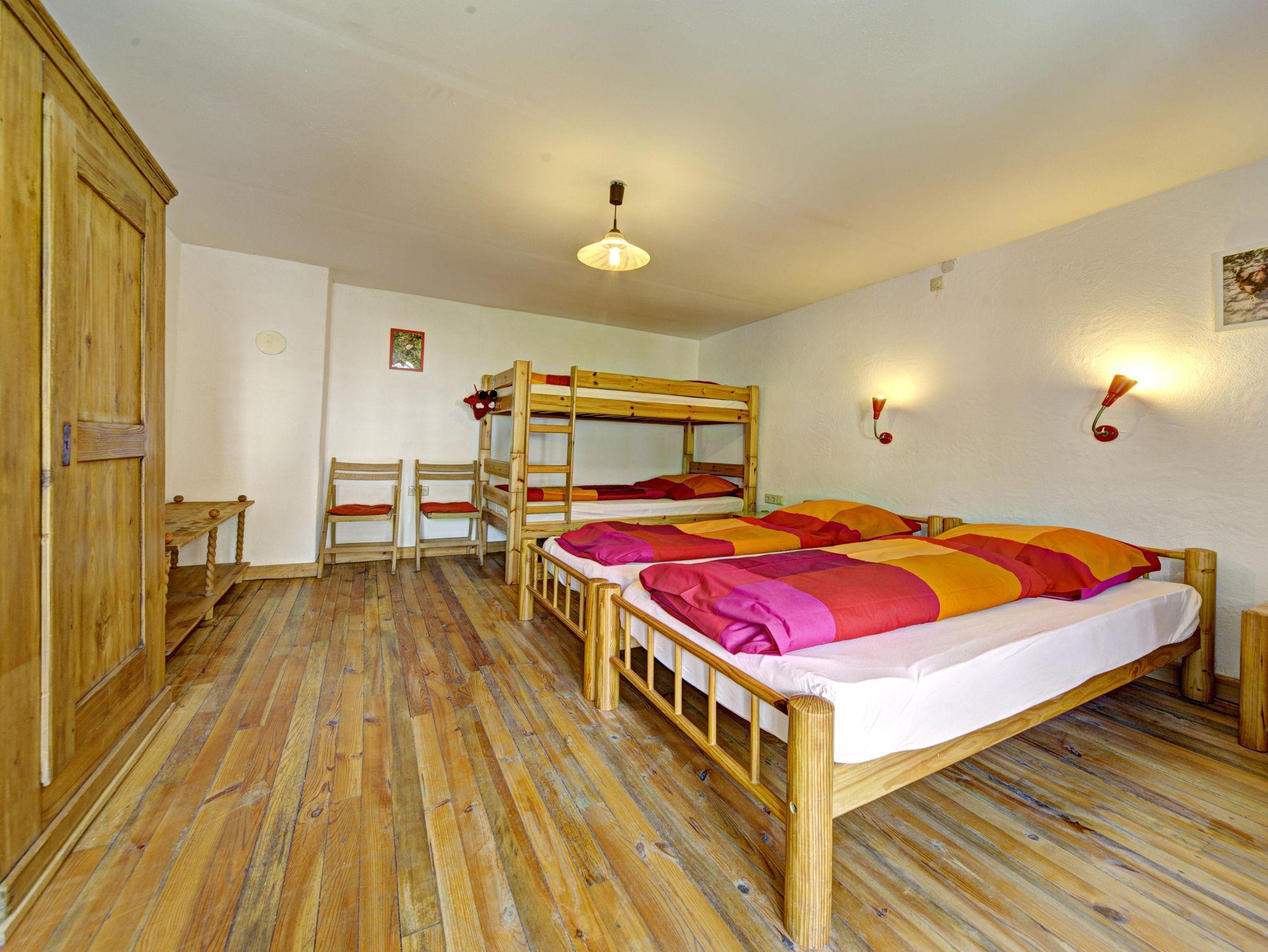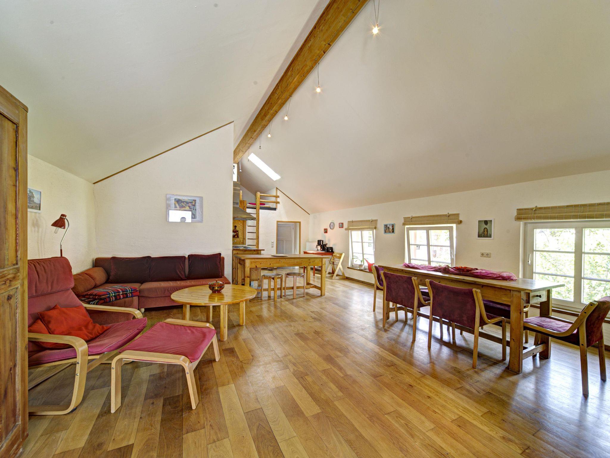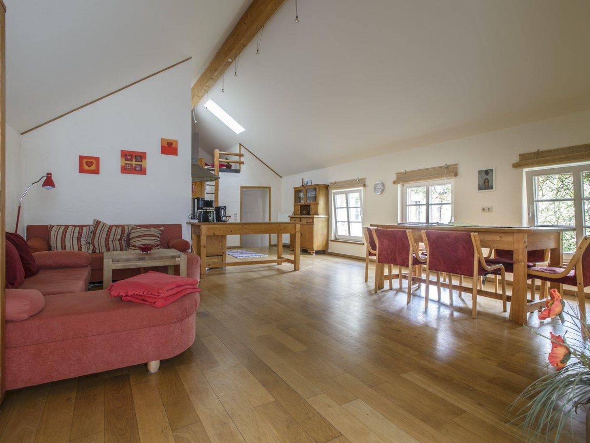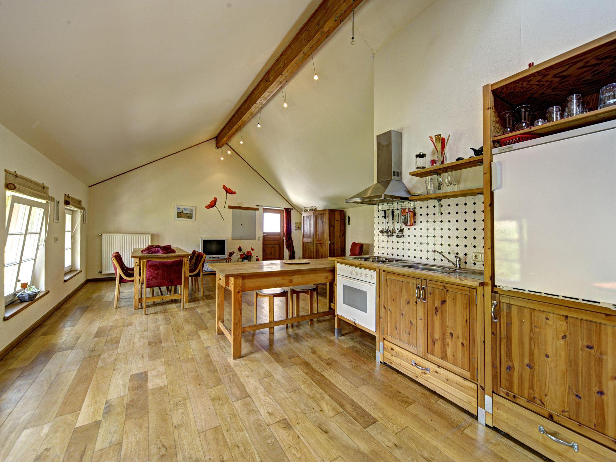 Die Ferienwohnung Mohnblume für bis zu 6 Personen liegt im ehemaligen Kornspeicher und erstrahlt in warmem Korngelb mit roten Akzenten, die an Mohnblumen zwischen den Ähren erinnern. Der großzügige Wohn-, Koch- und Essbereich bietet viel Platz für gemeinsames Kochen, Spielen, Musizieren und gemütliches Beisammensein. Durch die Klematisranken scheint die Sonne und erfüllt den Raum mit Licht und Leben. Die Wohnung verfügt über ein großes Vierbettzimmer mit Doppelbett und Etagenbett sowie eine romantische Schlafgalerie mit zwei weiteren Schlafplätzen. Das Bad mit Badewanne und WC sorgt für Entspannung, während die voll ausgestattete Küche, der große Esstisch und die gemütliche Sitzecke zum Verweilen einladen. Auf der sonnigen Terrasse lässt sich die Wärme genießen, während auf dem Grill die Leckereien brutzeln. Die Ferienwohnung Mohnblume verbindet Gemütlichkeit, Licht und Sommermomente – perfekt für Familien und Freunde.?