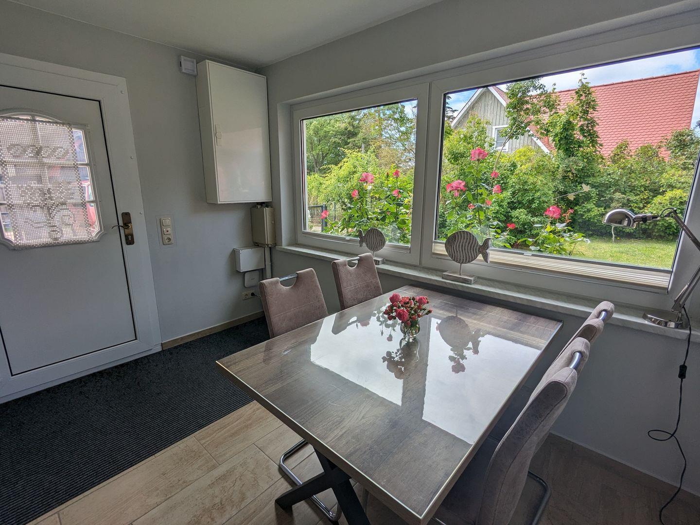 Die gut ausgestattete, geschlossene Küche mit einem Esstisch lädt dazu ein, gemeinsam zu kochen und zu speisen. Hier finden Sie alles, was Sie benötigen: einen Cerankochfeld-Herd, Backofen, Geschirrspüler und sogar eine Mikrowelle. Alles, was Sie für Ihre kulinarischen Kreationen brauchen, steht Ihnen zur Verfügung - inklusive einem Kühlschrank mit Gefrierfach, Kaffeemaschine und Wasserkocher. Genießen Sie Ihre Mahlzeiten im Esszimmer oder auf der sonnigen Terrasse mit Gartenmöbeln und Blick auf die malerische Landschaft.