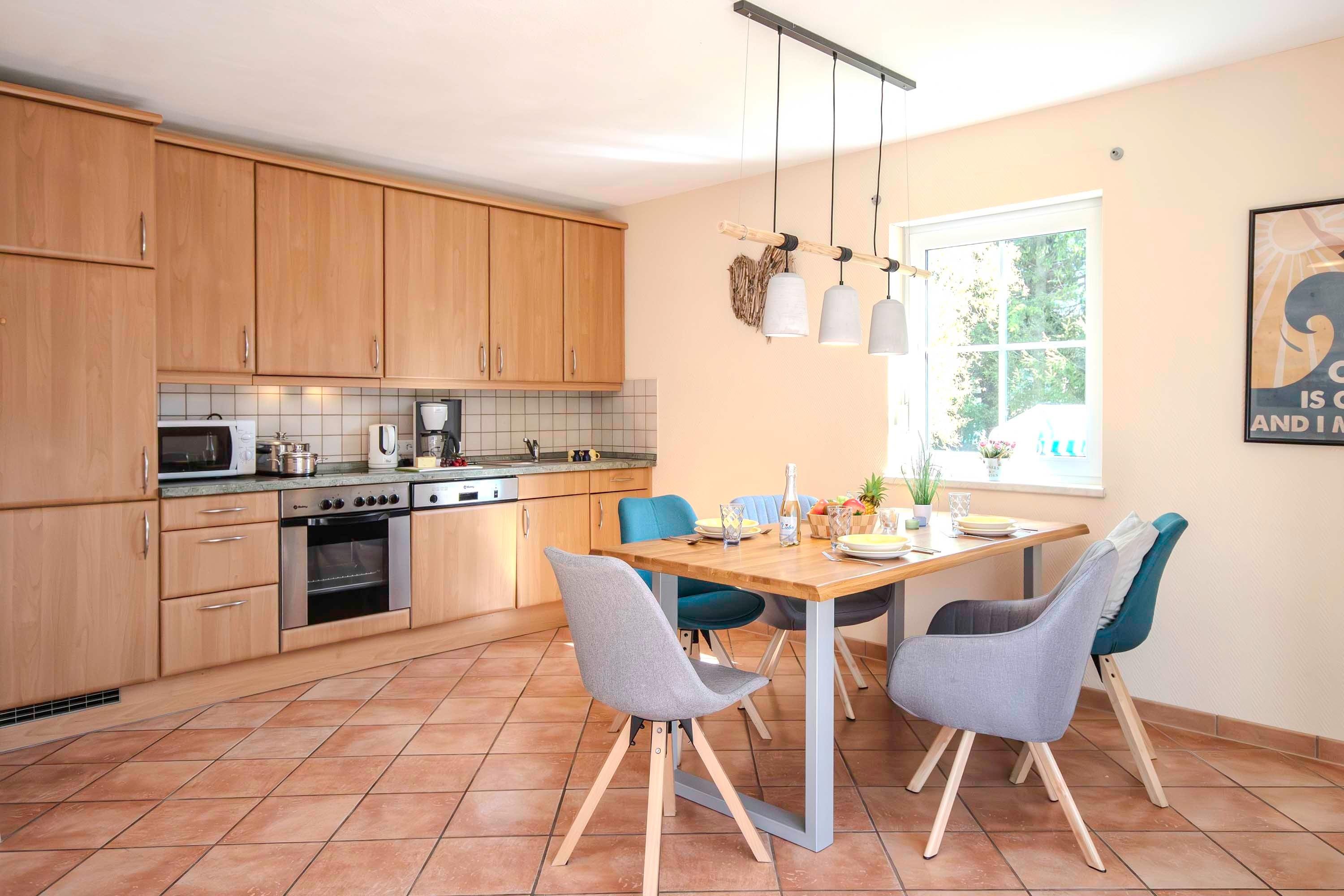 Voll ausgestattete Küche mit Backofen, Geschirrspüler, Kühlschrank, Mikrowelle, Kaffeemaschine (Filter) und weiteren Annehmlichkeiten