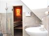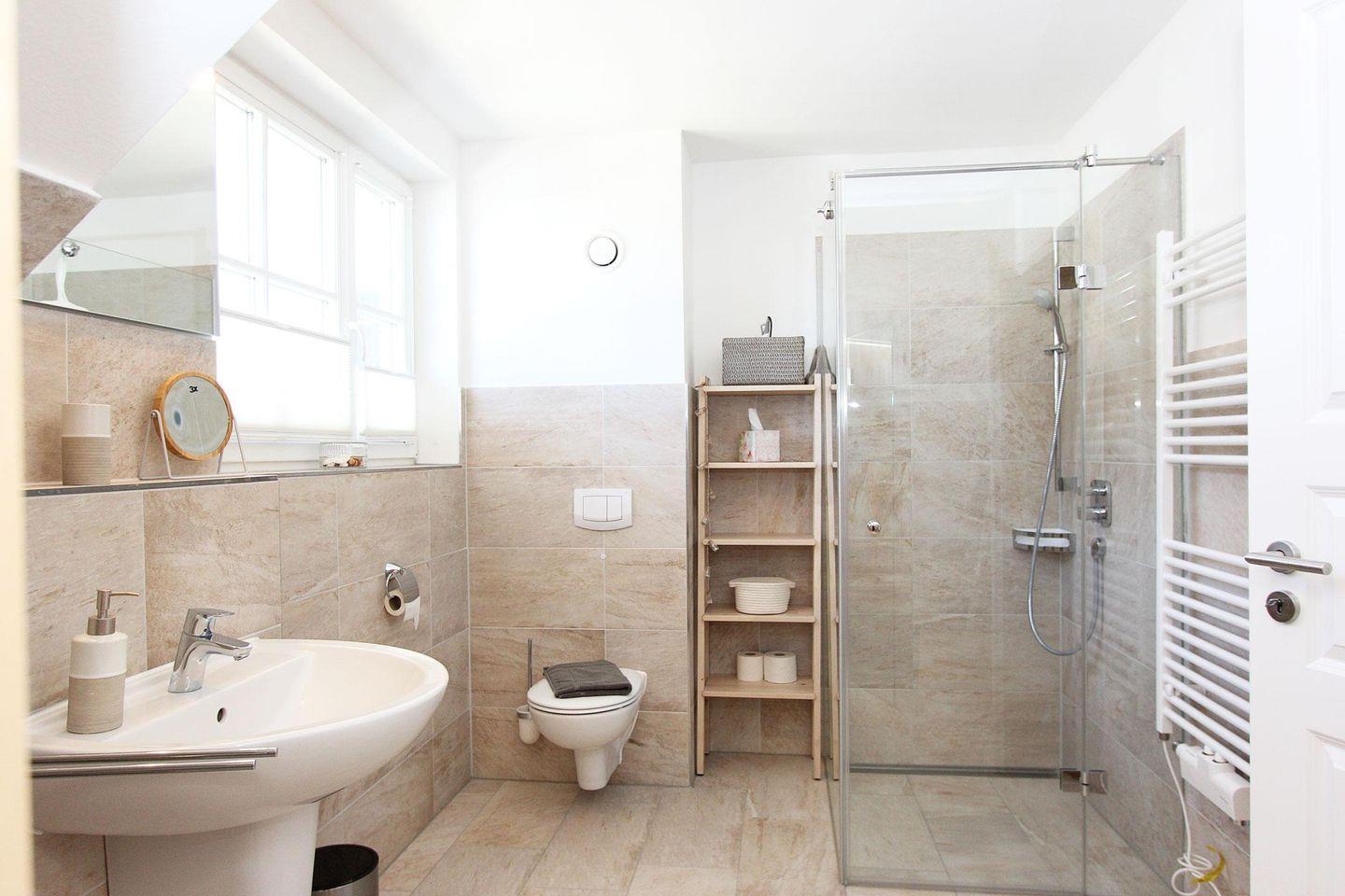 Über eine Eichenholztreppe erreicht man das Obergeschoss, welches aus den zwei Schlafzimmern mit hochwertigen Boxspringbetten und einem großen hellen Badezimmer mit einer begehbaren Dusche und angrenzender Sauna besteht.