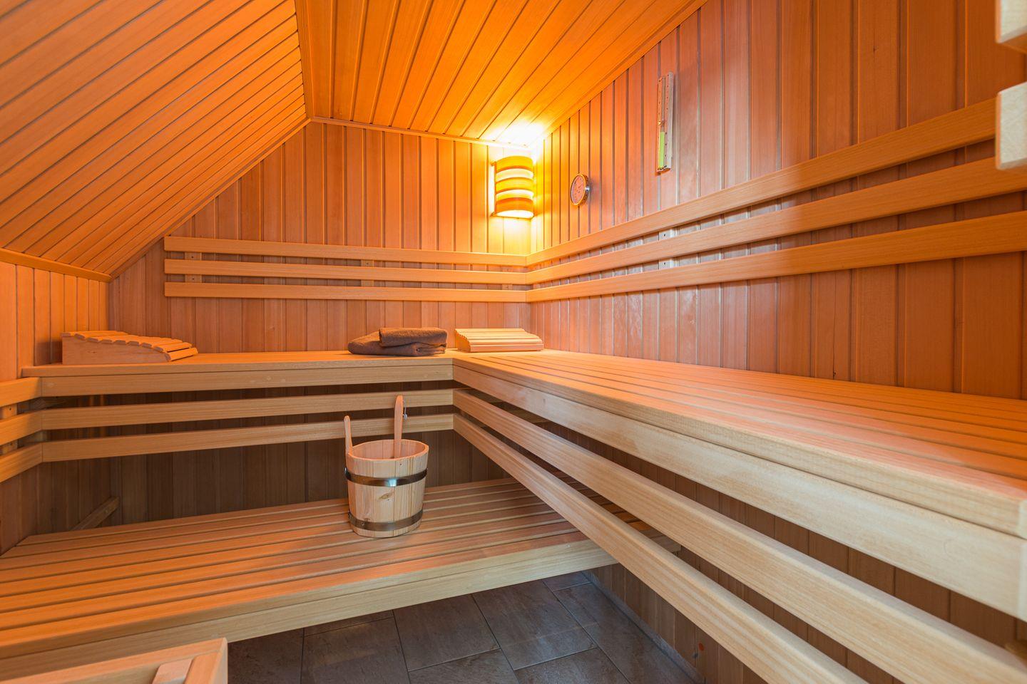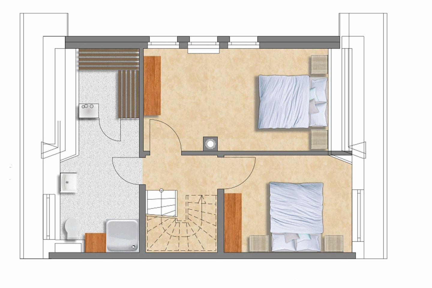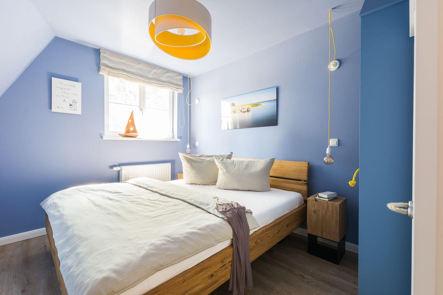 Über eine Eichenholztreppe erreicht man das Obergeschoss, welches aus den zwei Schlafzimmern mit je einem Doppelbett (180x200) besteht. Auf derselben Etage finden Sie das sehr geräumige Badezimmer mit Dusche, Fußbodenheizung und angrenzender, großzügiger Sauna.