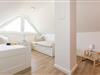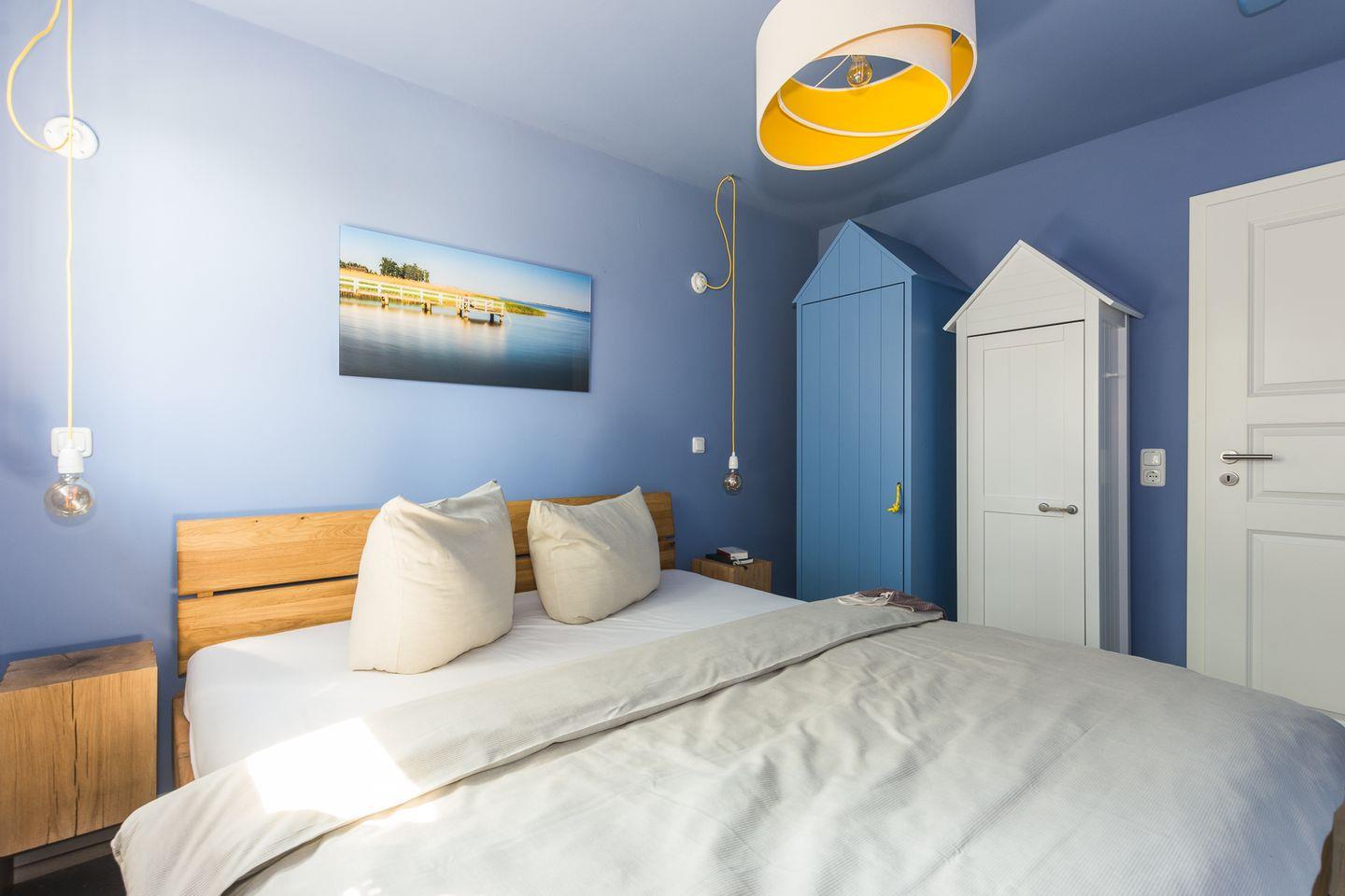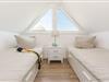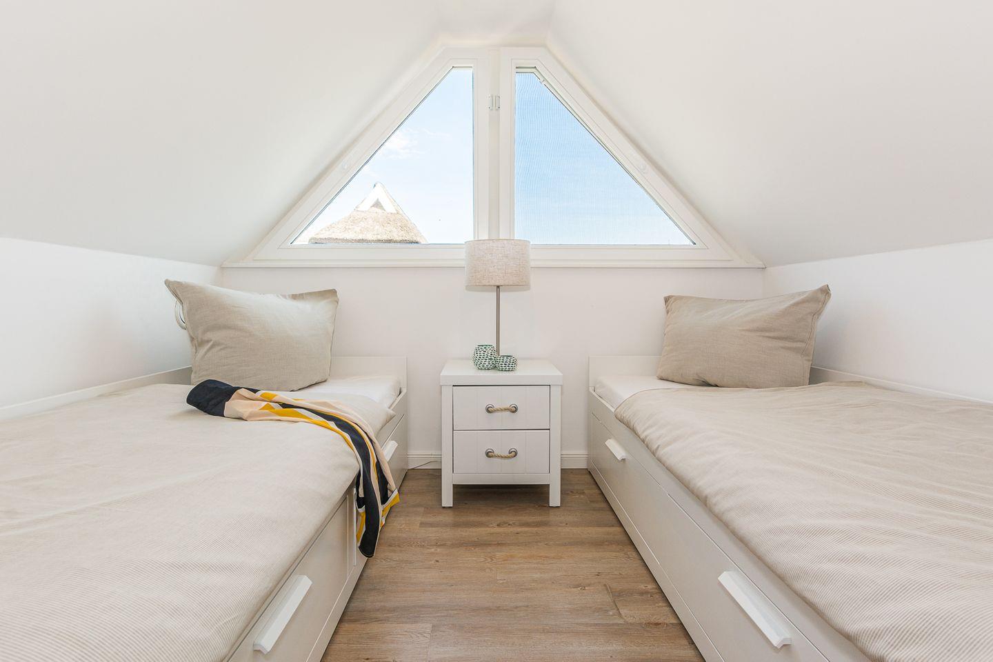 In dem liebevoll eingerichteten Spitzboden stehen zwei Einzelbetten für die Kinder. Von hier aus blicken Sie bis auf den Bodden.