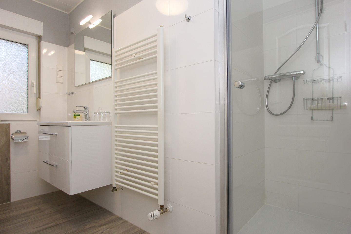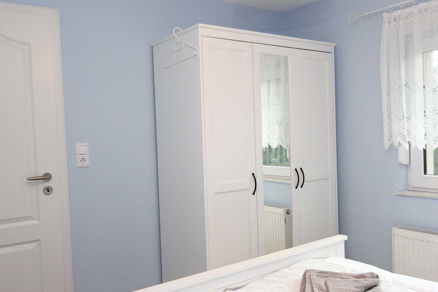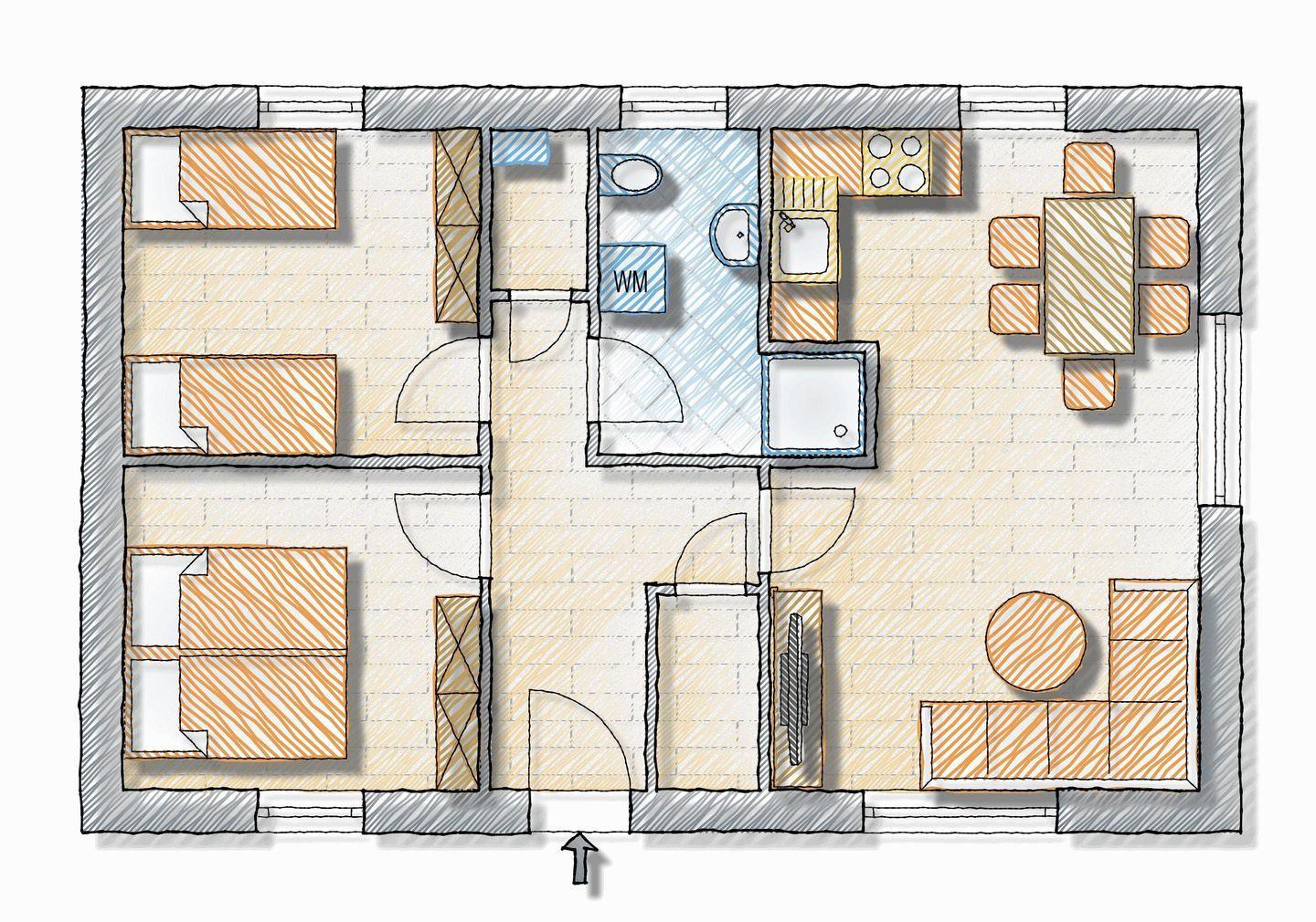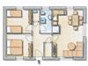 Ebenfalls im Erdgeschoss befinden sich zwei Schlafzimmer mit einem Doppelbett und zwei Einzelbetten. Ein Abstellraum und ein Badezimmer mit Dusche, WC und Waschmaschine sind auch im unteren Bereich des Hauses zu finden.
