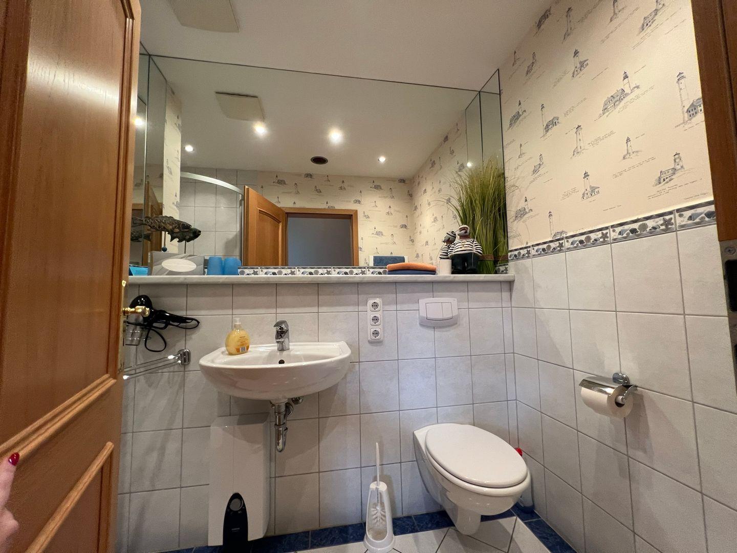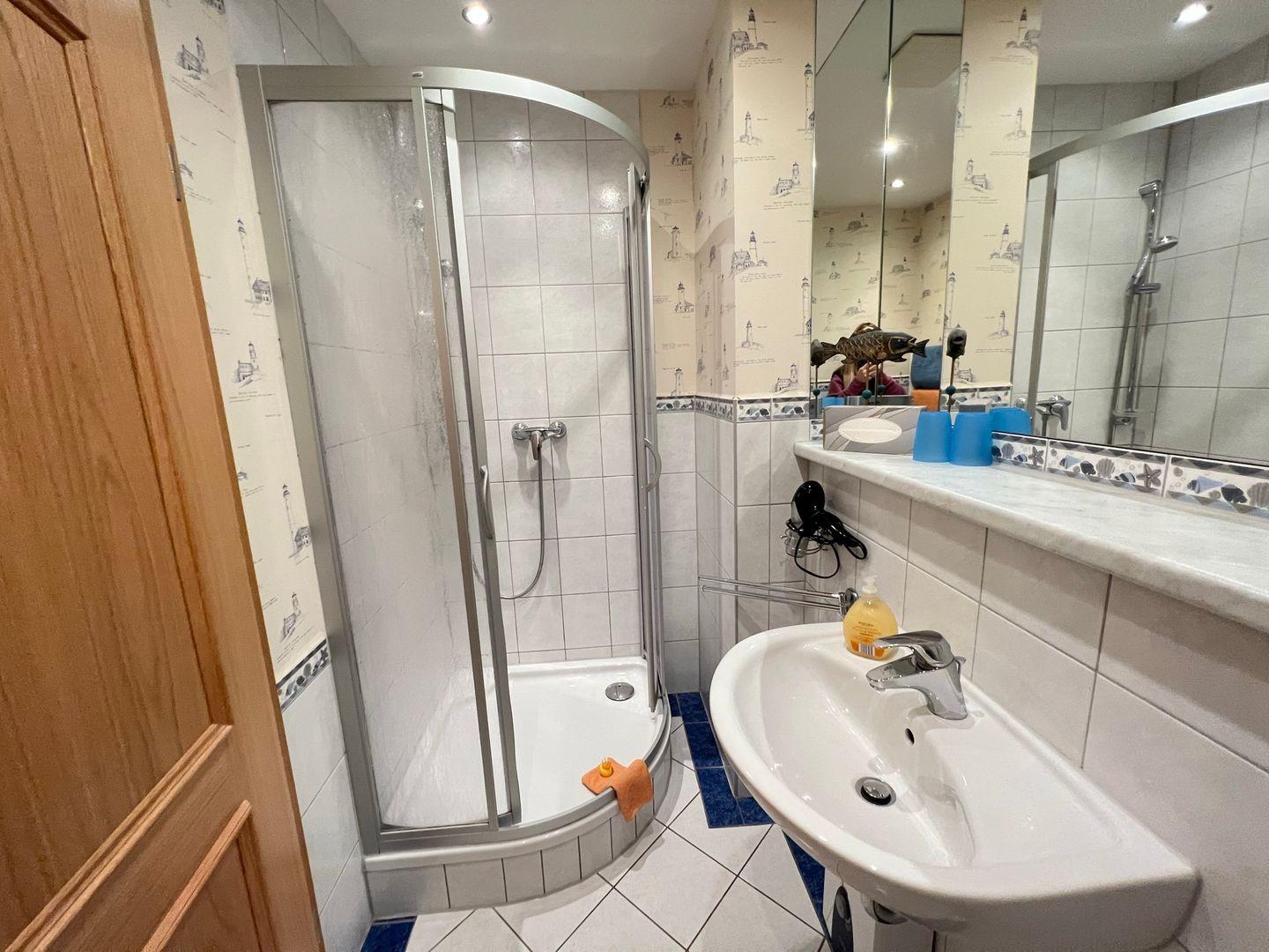 * Bad mit Waschbecken, großem Spiegel, Dusche/WC & einer Infrarot-Wärmelampe