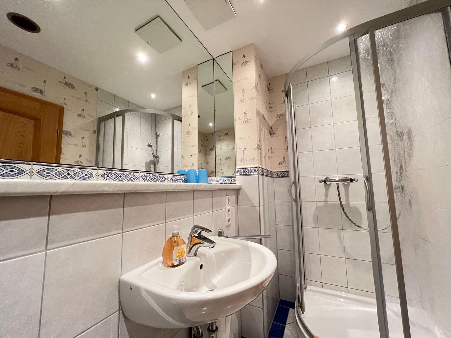 * Bad mit Waschbecken, großem Spiegel, Dusche/WC & einer Infrarot-Wärmelampe
