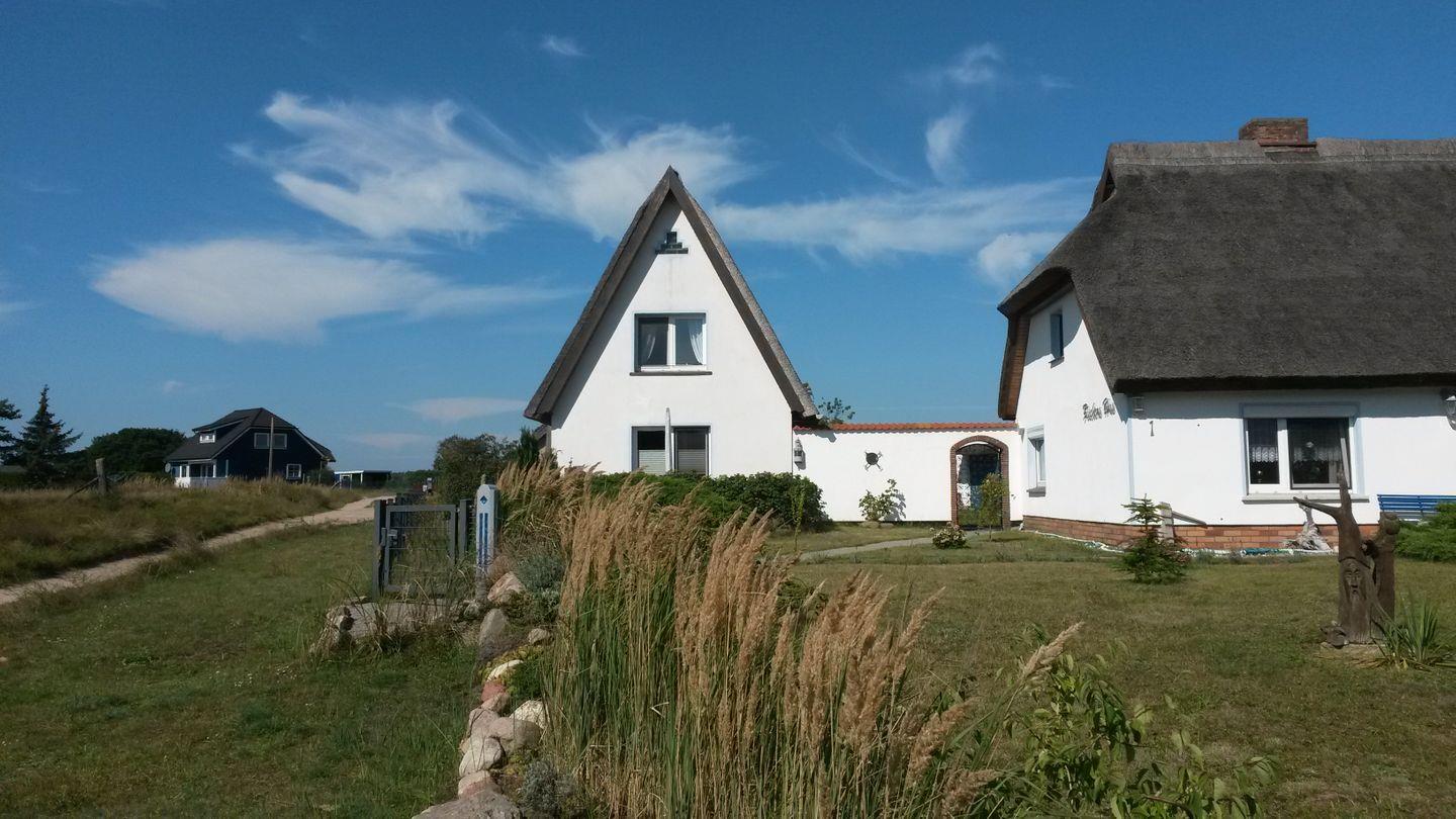 Unser Ferienhaus "Hagebutte" hat traditionell ein Rohrdach, eine begrünte Südterrasse (unverbauter Blick), einen separat abschließbaren Hauswirtschafts- und Fahrradraum.