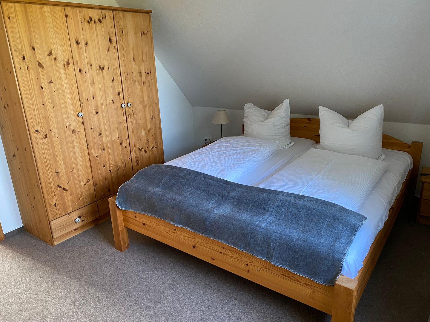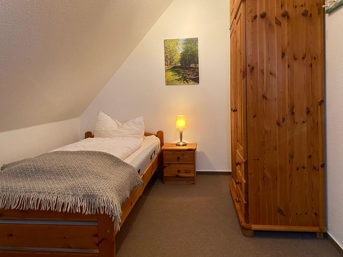 Im Obergeschoss befinden sich zwei separate Schlafzimmer. Eins ist mit einem Doppelbett (Maße: 180 x 200) und das andere mit einem Einzelbett (Maße: 100x200) ausgestattet.