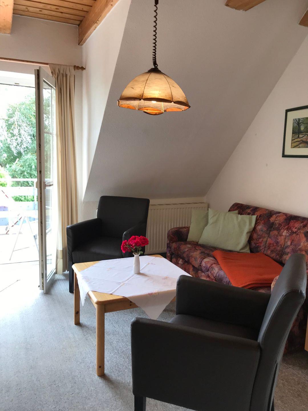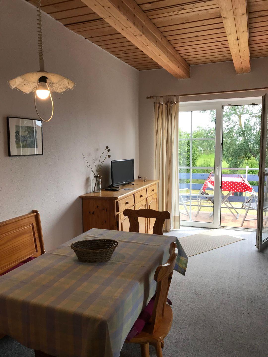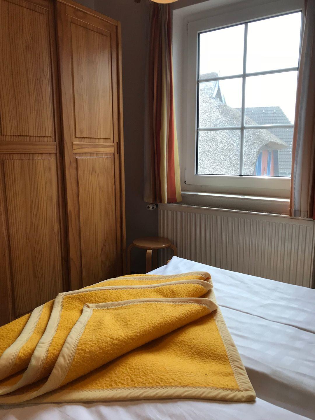 Die Ferienwohnung befindet sich im 1. Stock mit Balkon und Blick zum Bodden. Das Schlafzimmer verfügt über ein Doppelbett und großen Kleiderschrank.