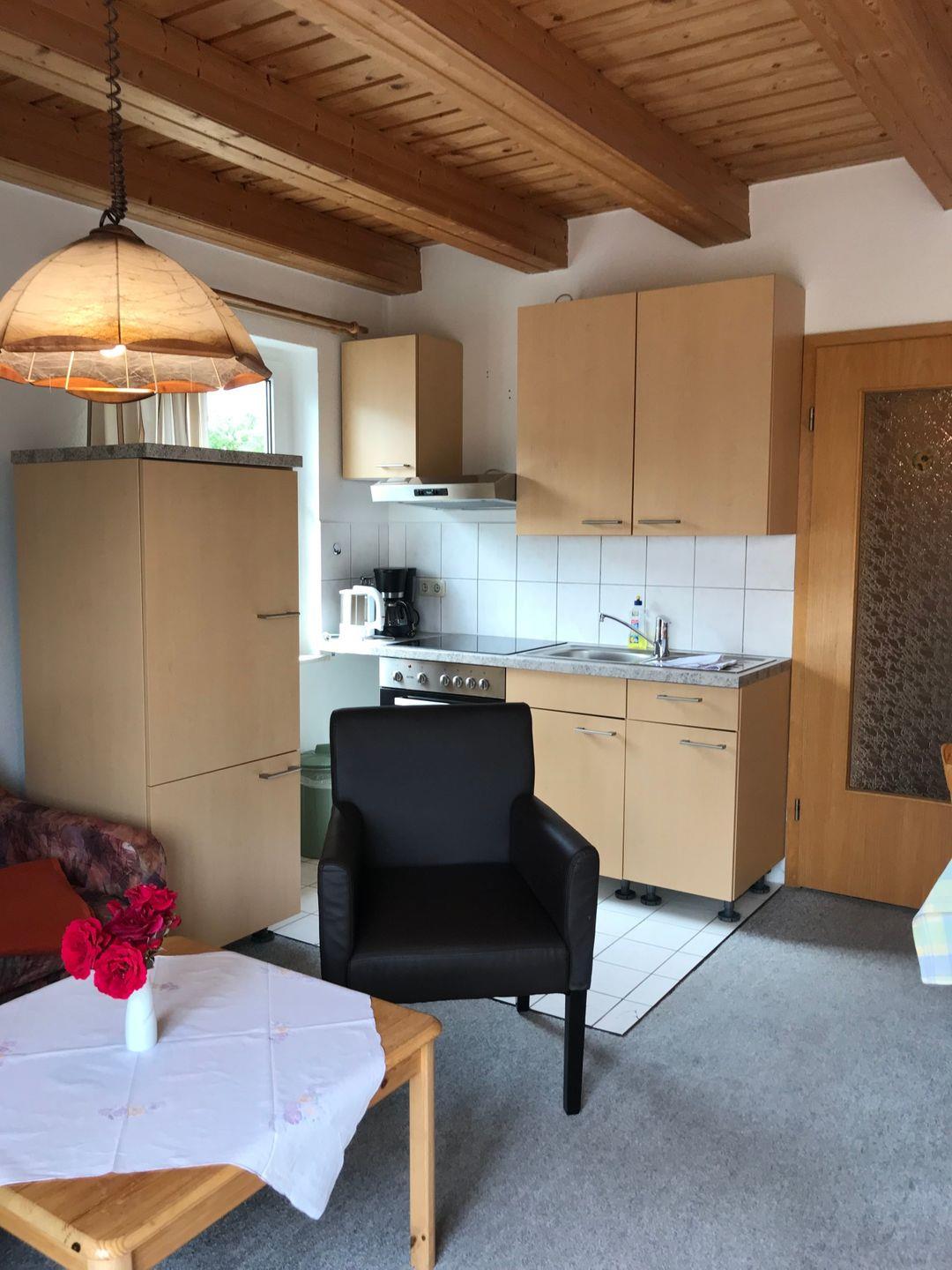 Im Wohnbereich ist eine Küchenzeile und ein Essplatz integriert .