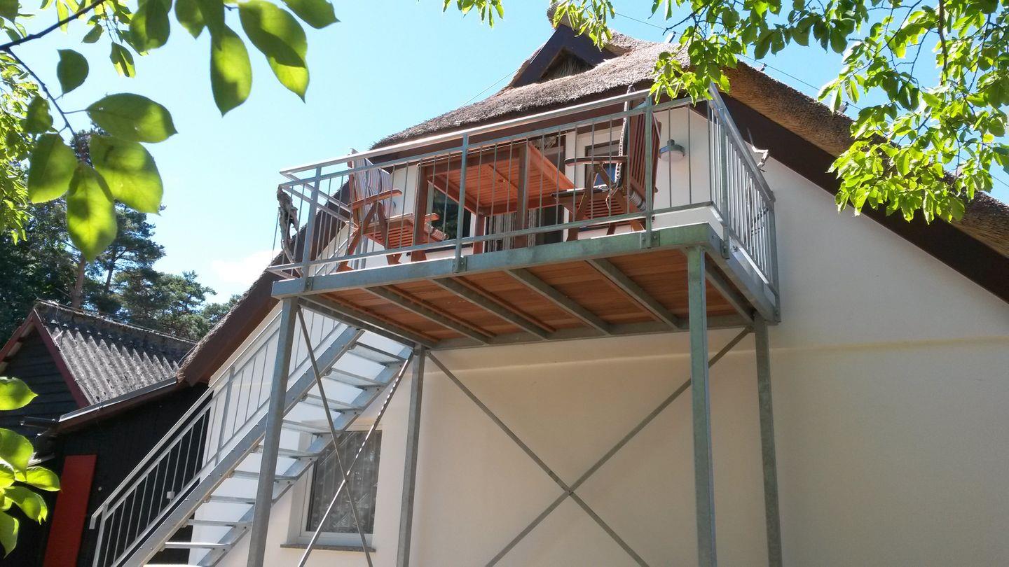 Zur Ferienwohnung gehört ein 6 Quadratmeter großer Balkon, der zum Frühstücken in der Sonne einlädt.