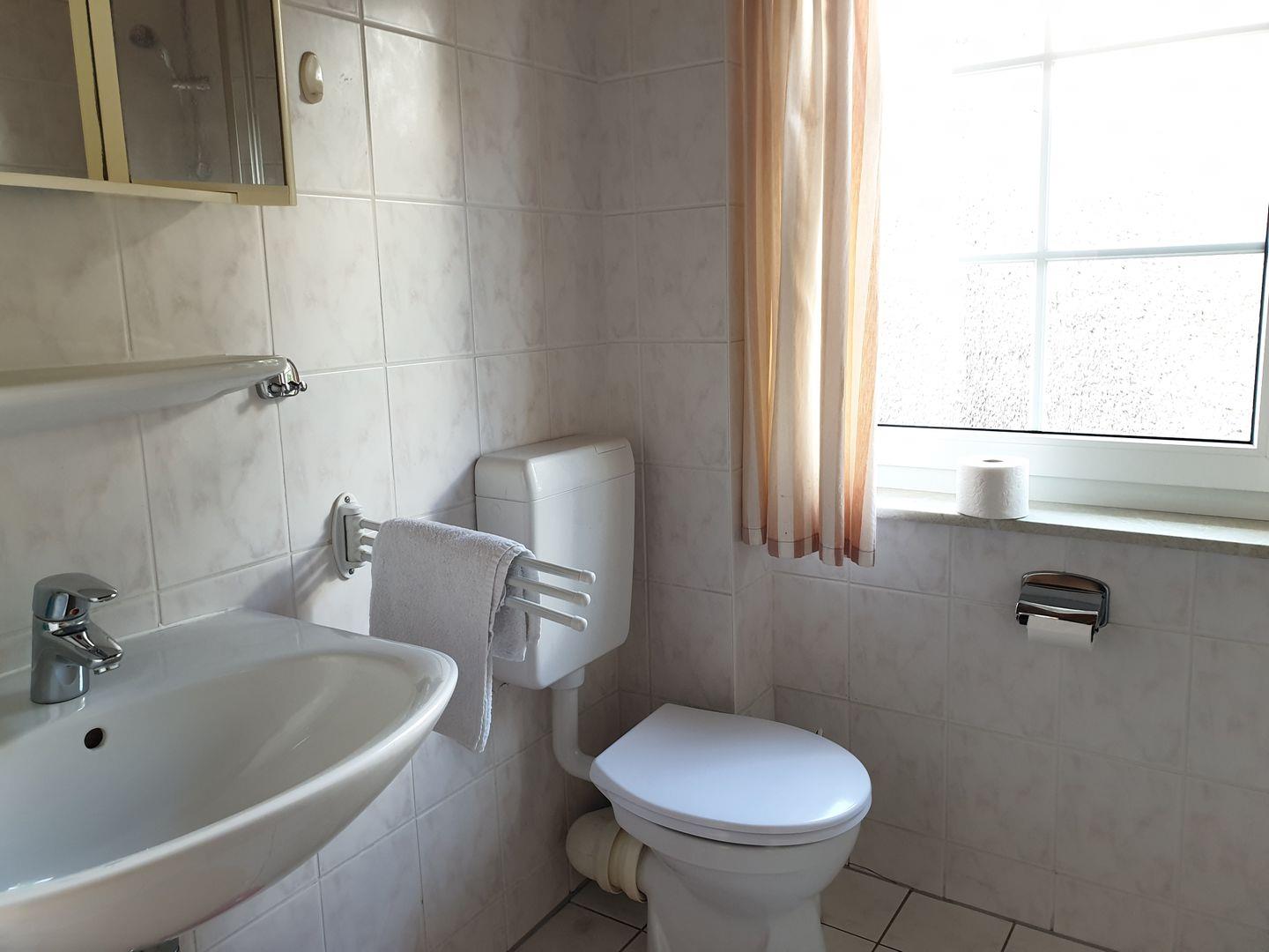 Das Bad verfügt über eine Dusche, WC,Warmwasser Heizung.