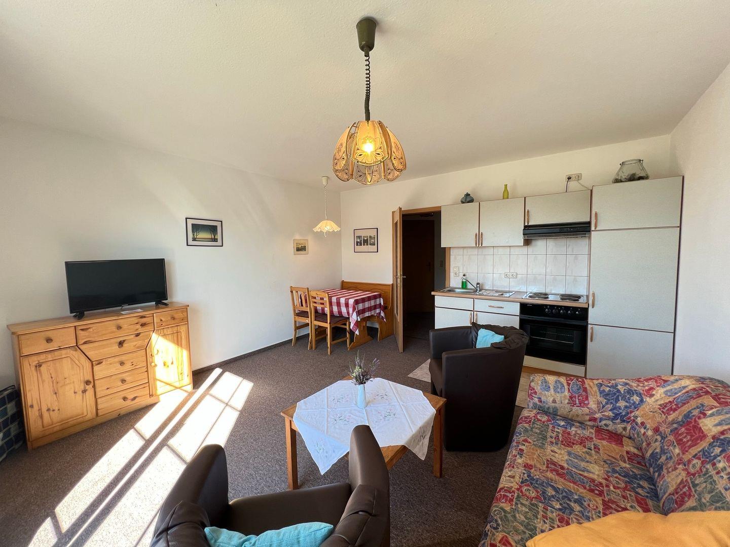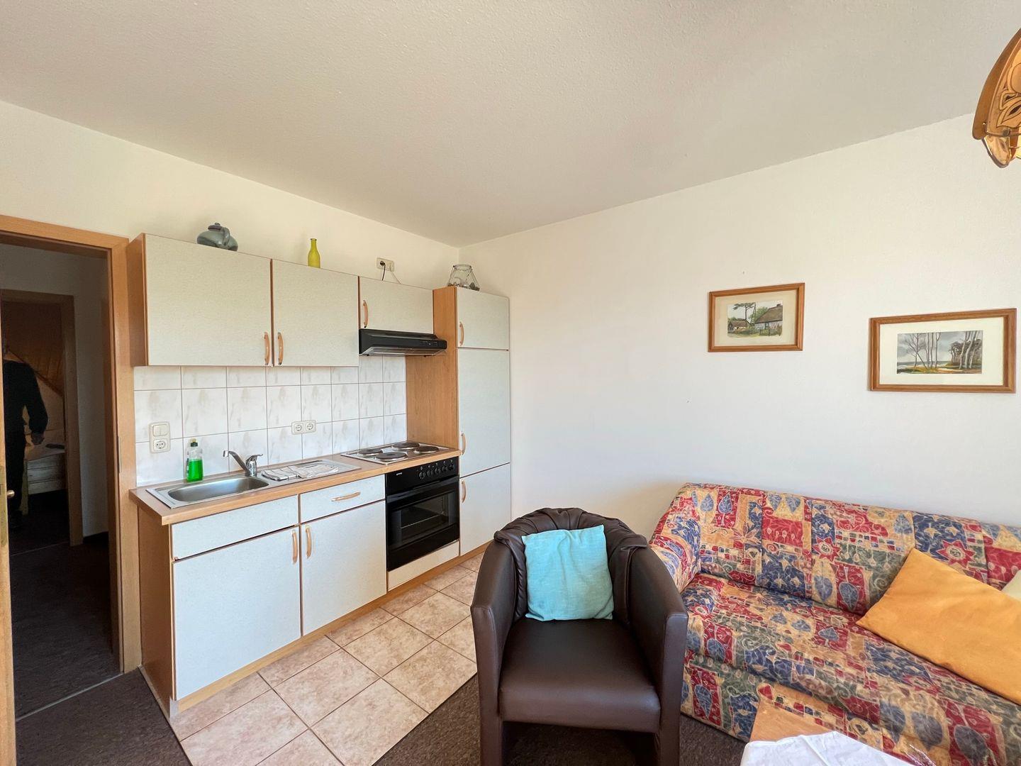Im Wohnbereich ist eine Küchenzeile und ein Essplatz integriert .