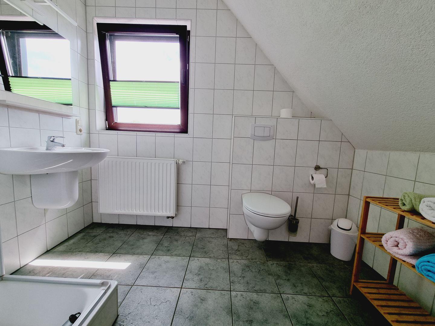 Im Badezimmer erwartet Sie eine Dusche mit kleiner Wanne und einem Fenster, das für natürliches Licht und frische Luft sorgt. Handtücher und Badetücher sind einmalig pro Aufenhalt inklusive, sodass Sie sich um nichts kümmern müssen und gleich ankommen können.