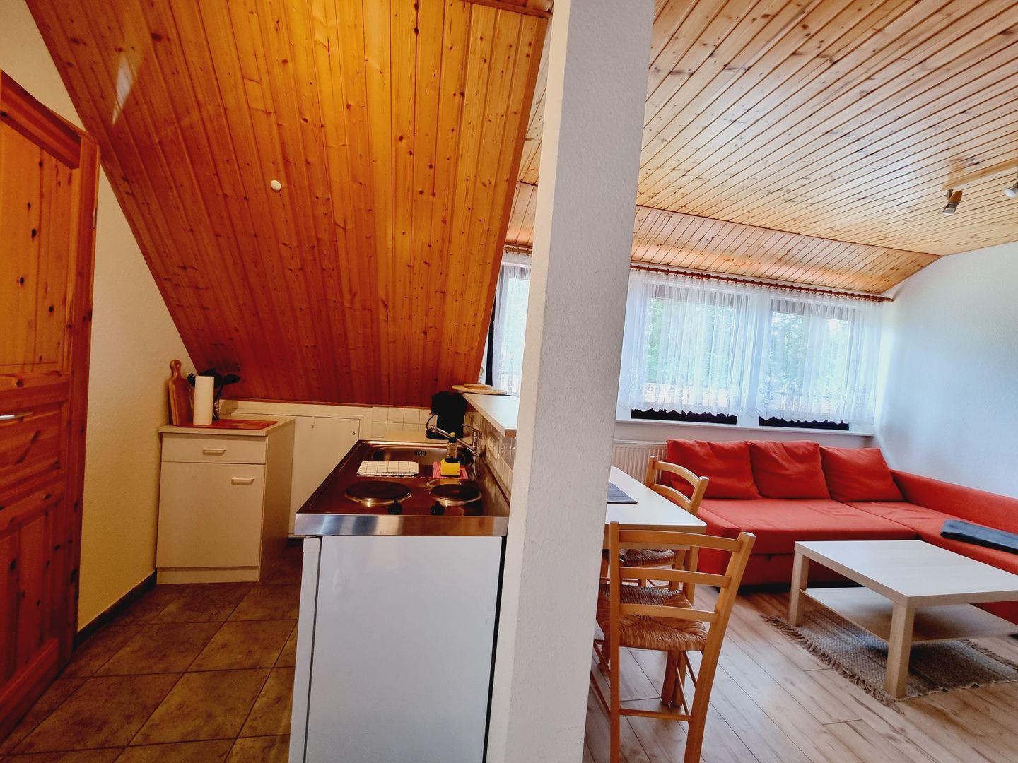 Die Wohnung befindet sich im Obergeschoss eines zweistöckigen Hauses und besteht aus zwei einladenden Zimmern, die mit einem Laminatboden ausgestattet sind und eine angenehme Atmosphäre schaffen. Das Schlafzimmer ist mit Bettwäsche versehen und bietet Sichtschutz für alle Fenster, um eine erholsame Nachtruhe zu gewährleisten.
