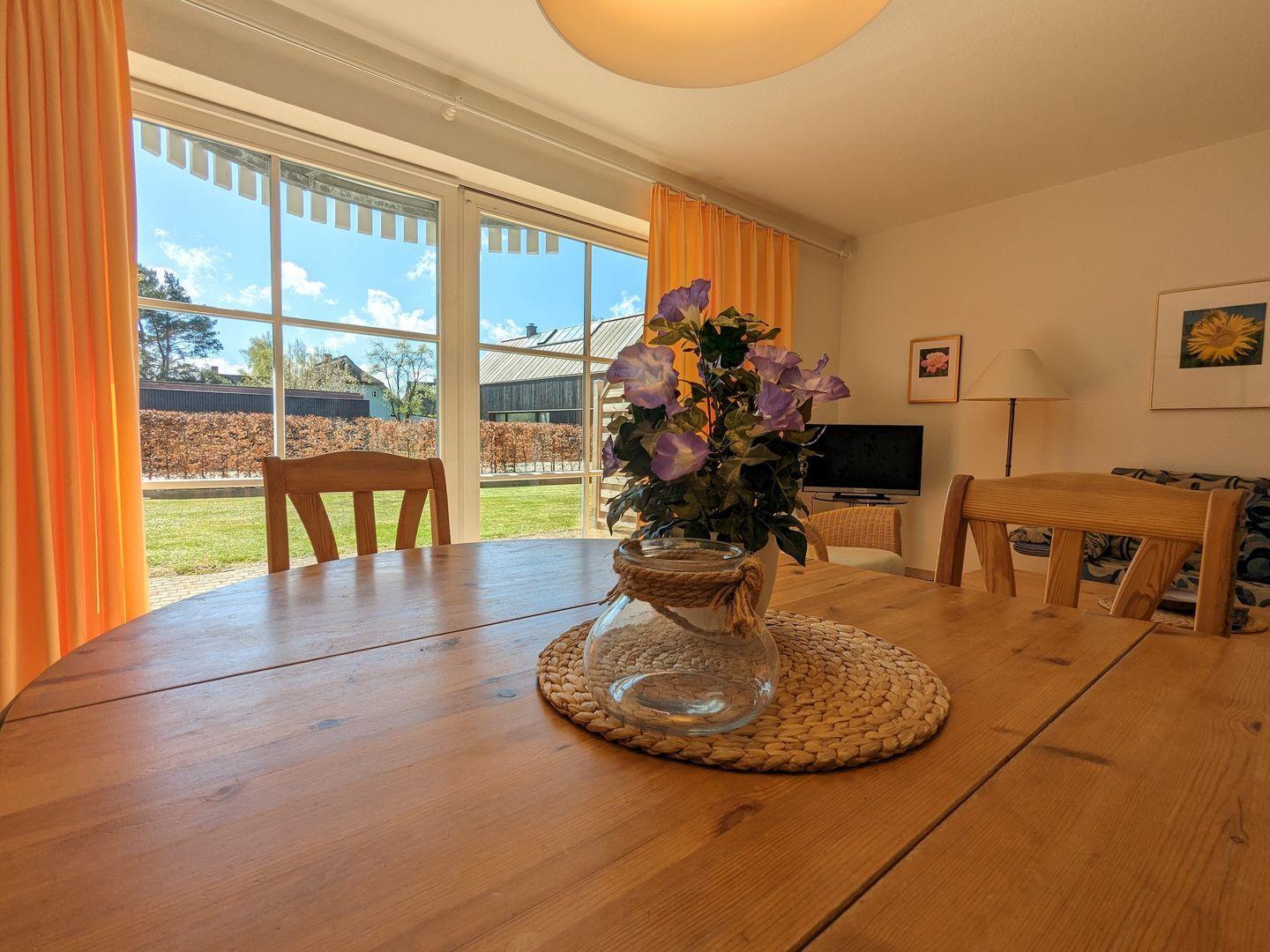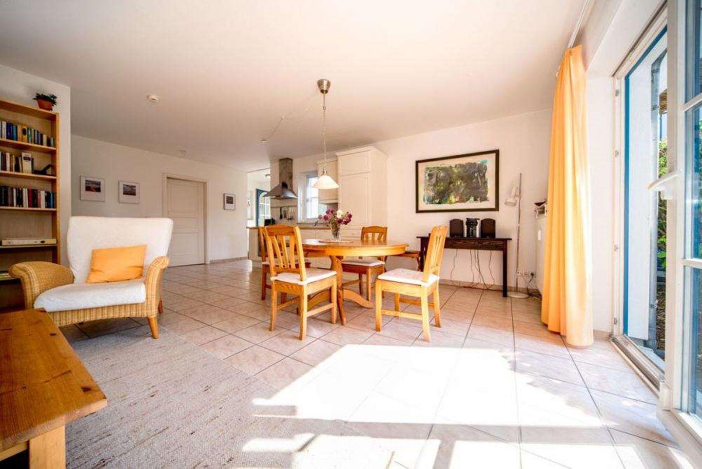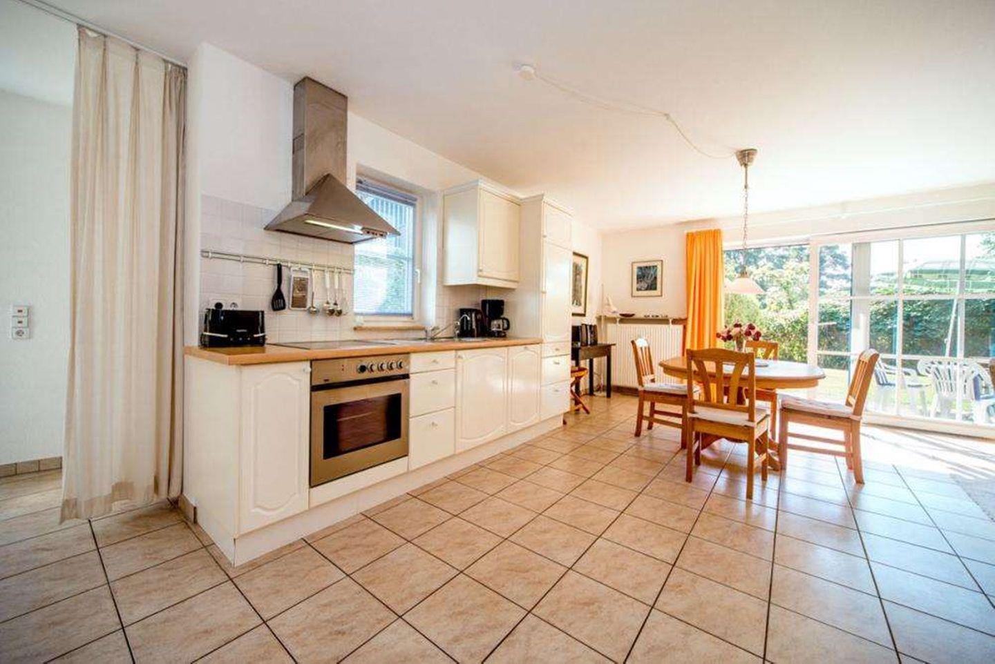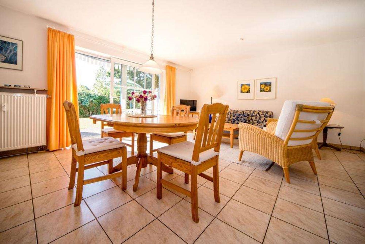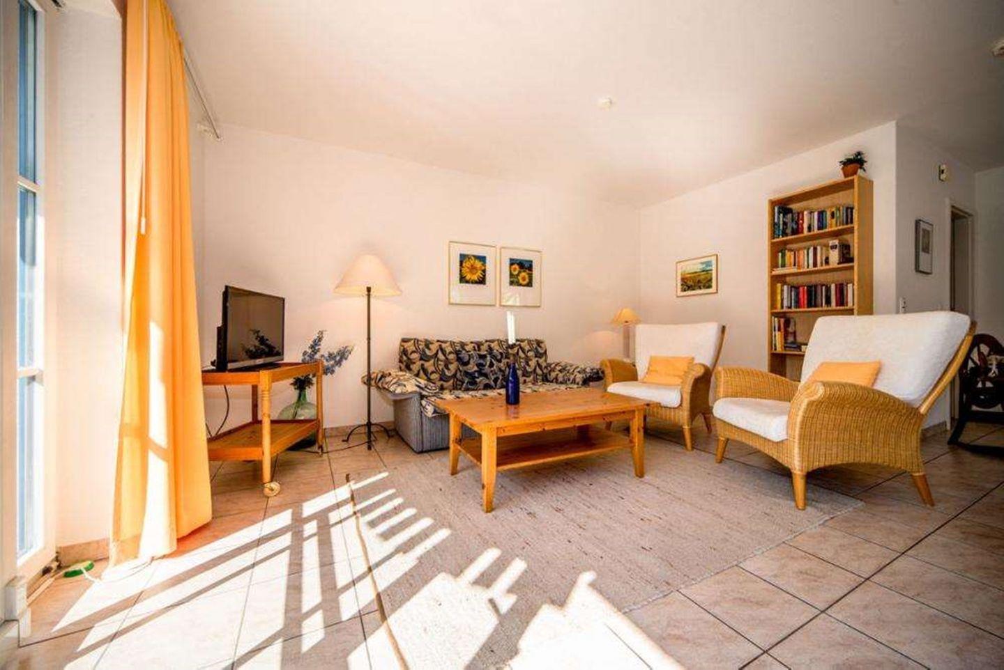Der Wohnbereich ist mit einem Sofa, dass sich zu einem Schlafplatz für zwei Personen ausklappen lässt, zwei Sessel und einem digitalen TV ausgestattet. In der offenen Küche mit Ceran-Kochfeld (4 Platten), Backofen, Spülmaschine, Kühlschrank mit Gefrierfach und zahlreichen Küchenutensilien können Sie kulinarische Köstlichkeiten zubereiten. Ein Esstisch und ein separater Essbereich bieten ausreichend Platz für gemeinsame Mahlzeiten.