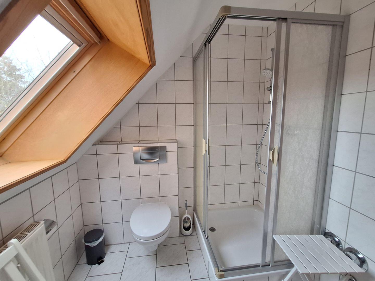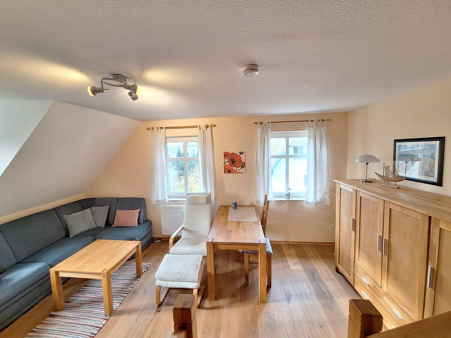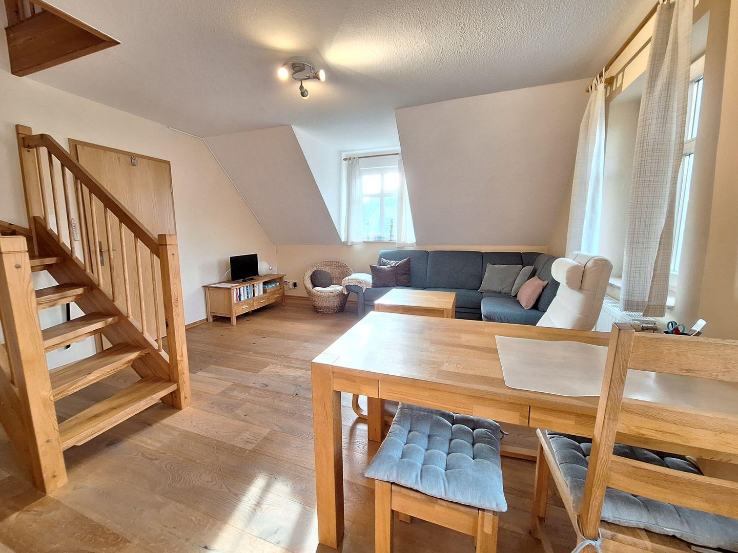 Gemütliche und ruhige Ferienwohnung, ideal geeignet für einen Aufenthalt zu zweit, gelegten in einer ruhigen Seitenstraße. Sie befindet sich im ersten Obergeschoss und verfügt über ein großzügiges Wohnzimmer, eine vollständig eingerichteten Küche, sowie ein Bad mit Dusche und WC. Über eine Treppe gelangen Sie in das Schlafzimmer. Zur Wohnung gehört ein Fahrradschuppen, ein Stellplatz für Ihren PKW und ein Sitzplatz im Garten vor dem Haus.