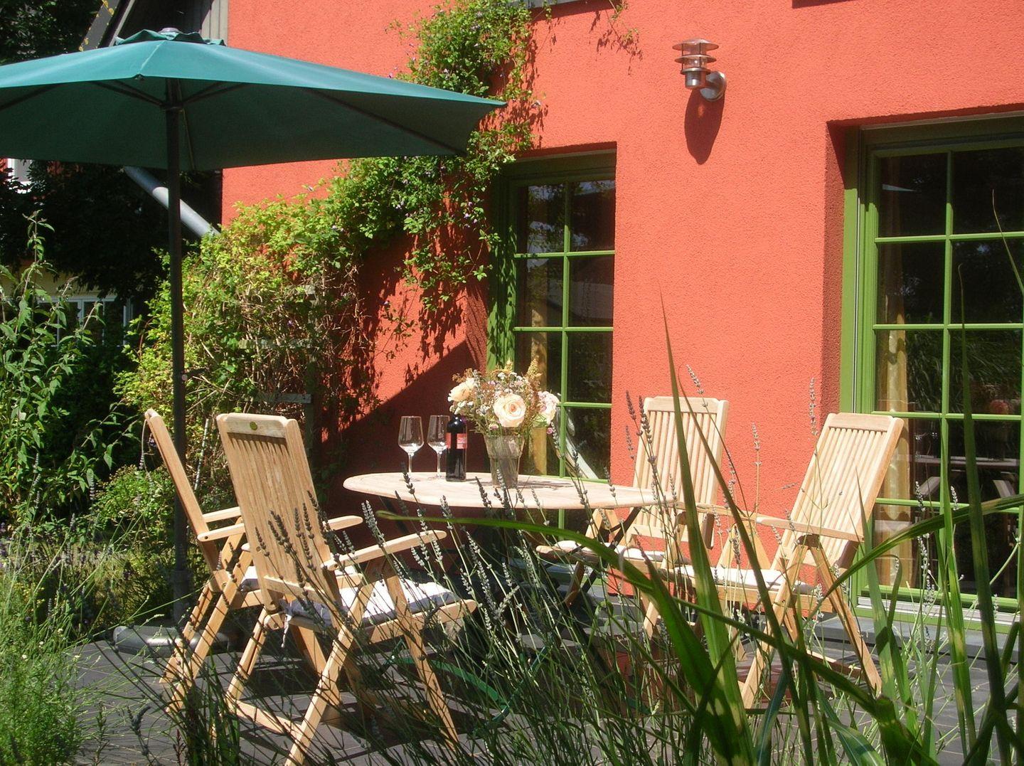 Vom Wohnzimmer aus treten Sie direkt auf die sonnige Süd-West-Terrasse, die mit bequemen Gartenmöbeln zum Verweilen einlädt. Ein eigener PKW-Stellplatz direkt am Haus zur Verfügung.