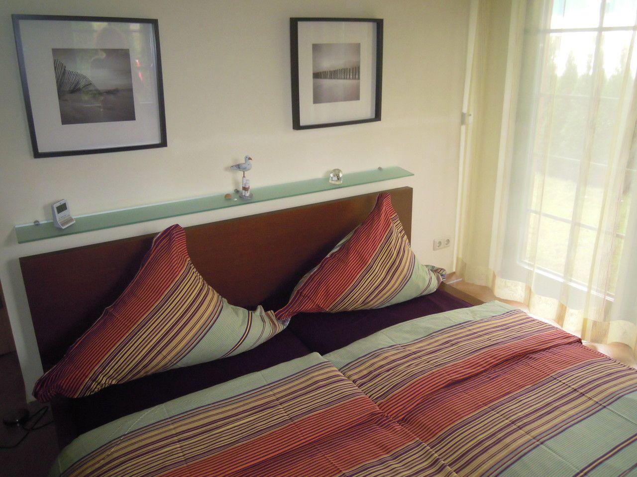 Die separaten Schlafzimmer sind mit einem komfortablen Doppelbett ausgestattet. Für einen ungestörten Schlaf sind alle Fenster in den Schlafzimmern mit Insektenschutzgittern sowie elektrischen Rollläden zur optimalen Verdunkelung versehen. Das moderne Badezimmer überzeugt mit einer großzügigen Dusche, Waschbecken und einer angenehmen Fußbodenheizung.