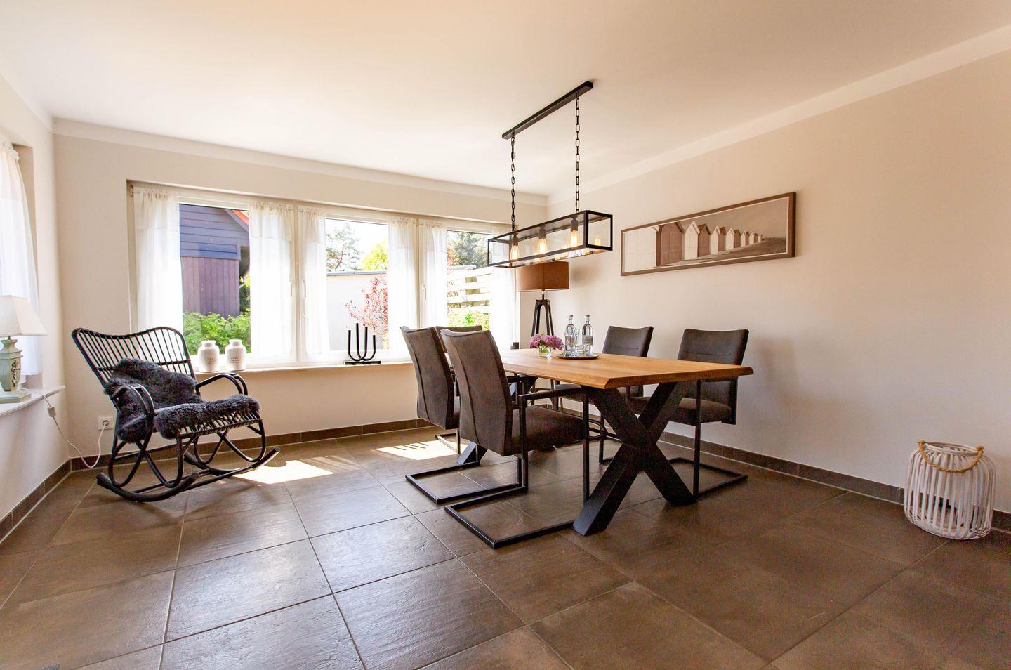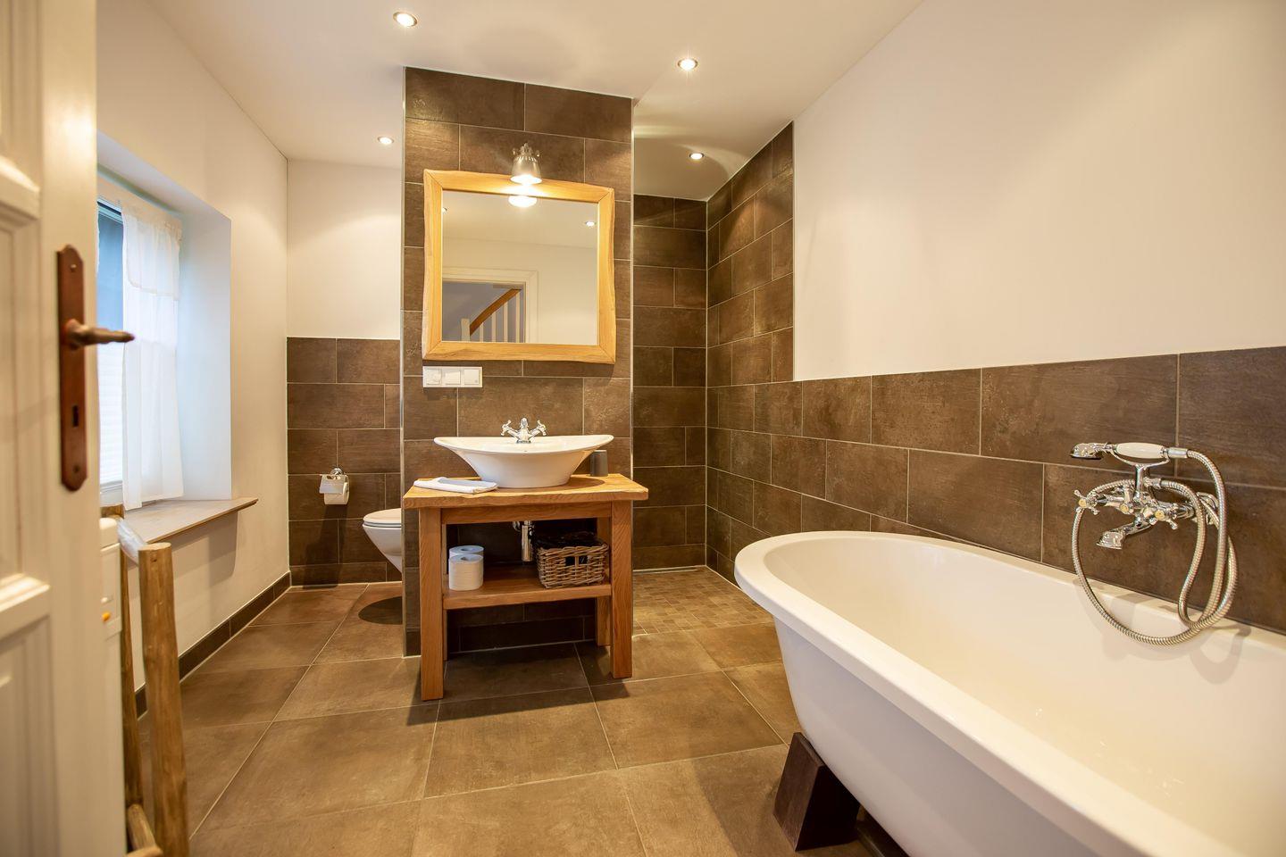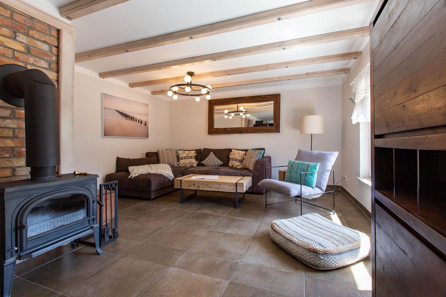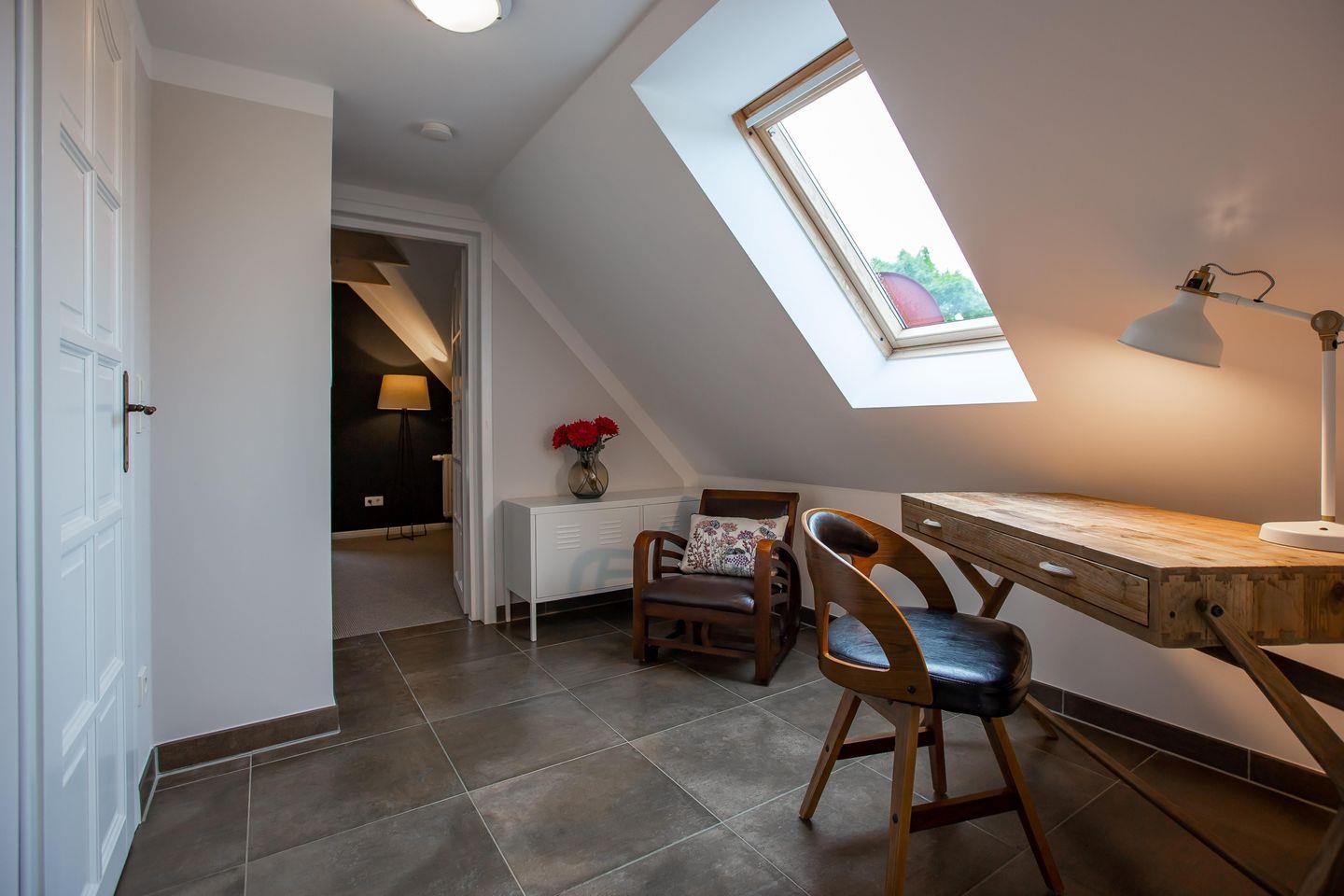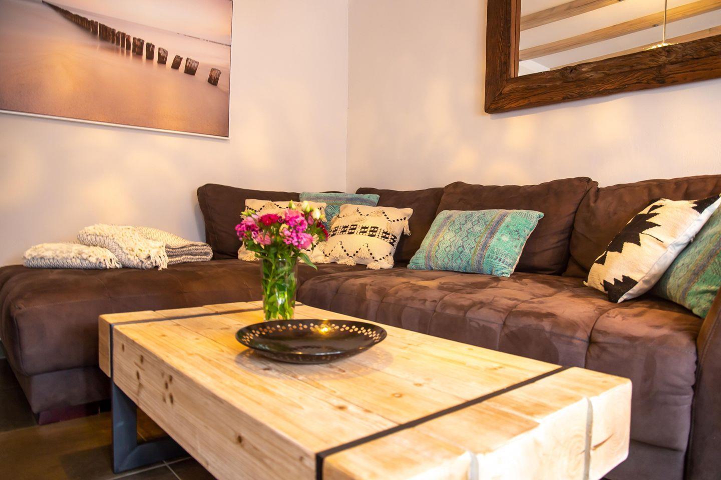 Typisch ländlich mutet dieses tolle Ferienhaus mit seiner hochwertigen Landhaus-Einrichtung, den natürlichen Farben und Materialien sowie den detailverliebten Deko-Elementen an. Der offene Wohn -und Küchenbereich lädt zum kommunikativen Kochen und gemütlichem Klönen auf dem modernen Sofa am Kamin oder in der Veranda ein. Ein gemütliches Schlafzimmer mit einem Doppelbett (180 cm) und ein sehr modernes Bad mit freistehender Badewanne und WC runden das Erdgeschoss ab. Im Obergeschoss erwarten dich zwei weitere Schlafzimmer mit je einem Doppelbett (160 cm und 140 cm). In einem der Schlafzimmer befindet sich ein zusätzliches TV-Gerät. Solltest du doch einmal in deinem Urlaub arbeiten müssen, dann steht dir ein moderner Schreibtisch im hellen Galeriebereich des Dachgeschosses zur Verfügung. Ein zusätzliches kleines Wohlfühl-Badzimmer mit Dusche/WC auf dieser Etage macht den Wohnkomfort perfekt.