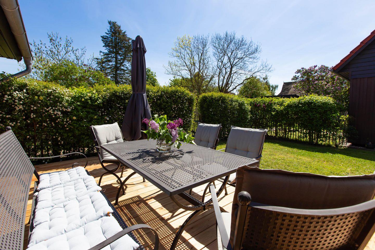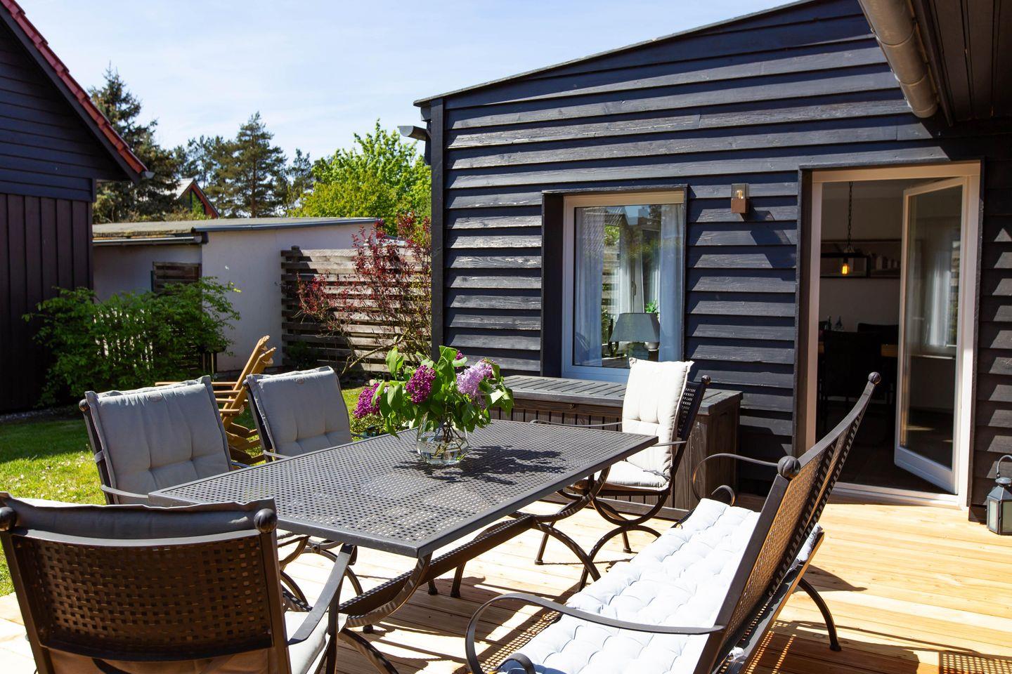 Eine sonnige Terrasse mit hochwertigen Möbeln befindet sich auf dem großzügigen Naturgrundstück und gehört ebenfalls zum Ferienhaus. Hier kannst du ganz entspannt in den Tag starten oder diesen mit einem leckeren Sommer-Barbecue ausklingen lassen. Außerdem stehen dir zwei PKW-Stellplätze zur Verfügung.