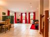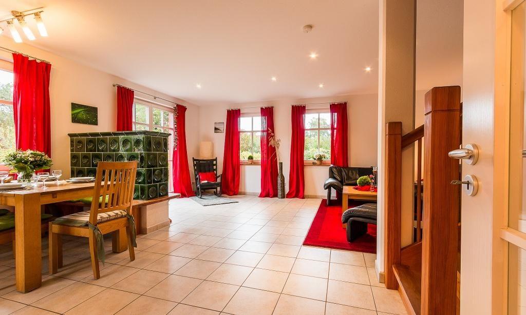 Im fischlandtypischen Stil erwartet dich die Reet-Doppelhaushälfte mit der buntgeschnitzten Darßer Haustür. Im Erdgeschoss gelangst du über den Flur mit Garderobe direkt in den großzügigen Wohnbereich. Blickfang ist der urige und zentral beheizte Kachelofen, der den Essbereich vom TV-Bereich trennt. Dank der bequemen Ledersofas hast du hier ausreichend Platz, um mit der ganzen Familie gemütliche Fernsehabende zu verbringen. Die offene und voll ausgestattete Küche lädt zum gemeinsamen Kochen und Klönen am Esstisch ein. Des Weiteren befindet sich auch ein barrierefreies Bad mit Dusche und WC auf der unteren Etage. Auf Wunsch kann ein Zustellbett im Wohnbereich aufgestellt werden, so dass sich die Parterre auch sehr gut für Rollstuhlfahrer nutzen lässt.