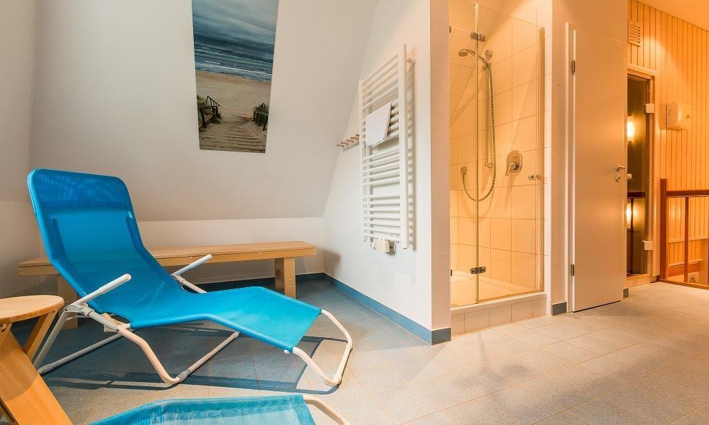 Über eine Naturholztreppe gelangst du in das Obergeschoss. Hier befinden sich die drei Schlafzimmer, die mit je einem Doppelbett ausgestattet sind. Warme Farben, hochwertige Holzmöbel und der Dielenboden sorgen für zusätzliche Behaglichkeit, die den Schlaf fördert und dir erholsame Nächte schenkt. Ein weiteres Badezimmer mit Dusche und WC ist ebenfalls auf dieser Etage untergebracht. Eine eigene kleine Wellness-Oase wartet im Spitzboden auf dich. Denn die Klafs-Sauna und die angrenzende Schwalldusche sorgen für die richtige Entspannung nach einem aktiven Urlaubstag und bieten Wohlfühlkomfort zu jeder Jahreszeit. Das separate WC rundet den Wellnessbereich perfekt ab.