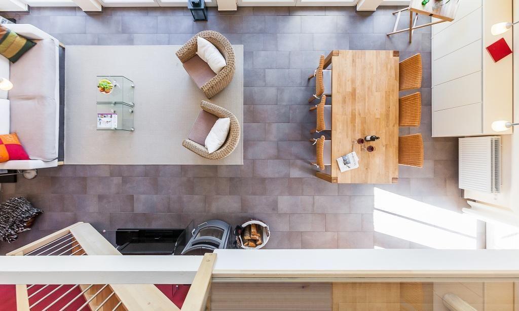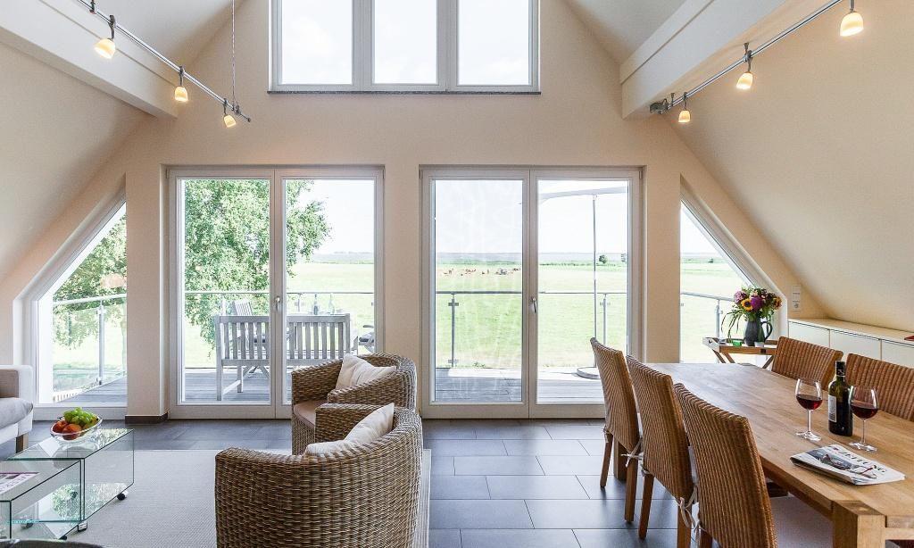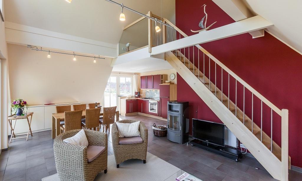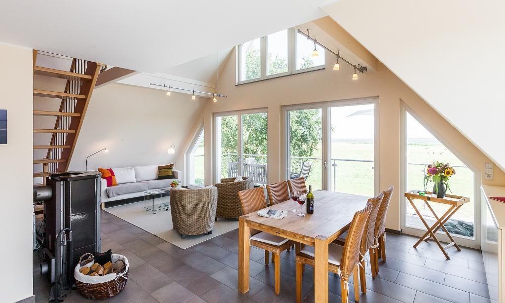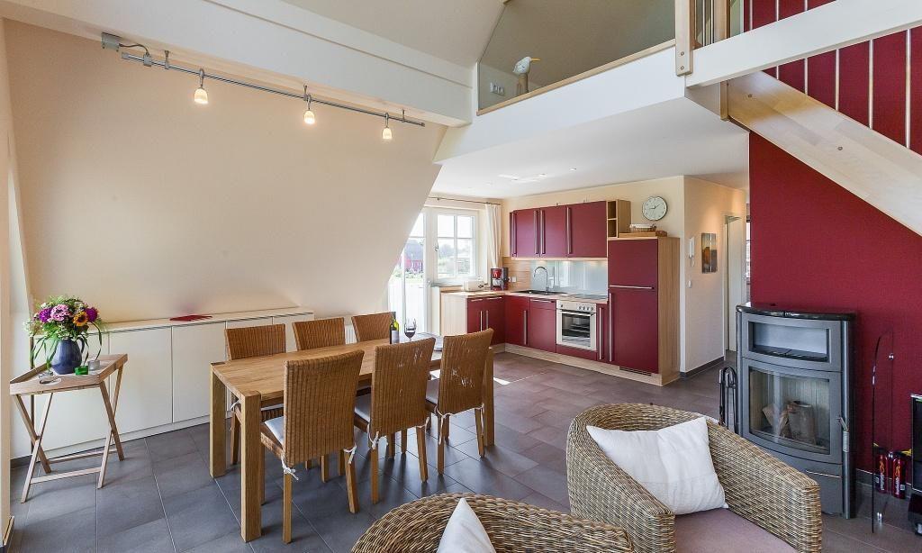 Die Wohnung im Obergeschoss erstreckt sich als Maisonette-Wohnung über zwei Etagen. Der großzügige Wohnraum mit hochwertiger Einrichtung bietet dir eine gemütliche Sitzecke am Kaminofen und den Austritt zum sonnigen Südbalkon mit einem traumhaften Panoramablick auf den Bodden. Der Essbereich mit komfortabler Küchenzeile fügt sich harmonisch in den Wohnbereich ein und besticht durch seine klaren Linien. Von der Küche hast du Zutritt zu einem zweiten kleinen Balkon. Ein modernes Bad mit Dusche/WC und die beiden Schlafzimmer befinden sich ebenfalls auf der ersten Etage. Das Hauptschlafzimmer ist mit einem Doppelbett und das weitere mit zwei Einzelbetten ausgestattet. Vom Wohnbereich gelangst du auf die zweite Etage. Hier erwartet dich eine kleine Wellnessoase mit Sauna, Gäste-WC und Ruhebereich. Du genießt auch hier einen fantastischen Blick auf den Bodstedter Bodden. Ein erholsamer Urlaub ist dir garantiert!