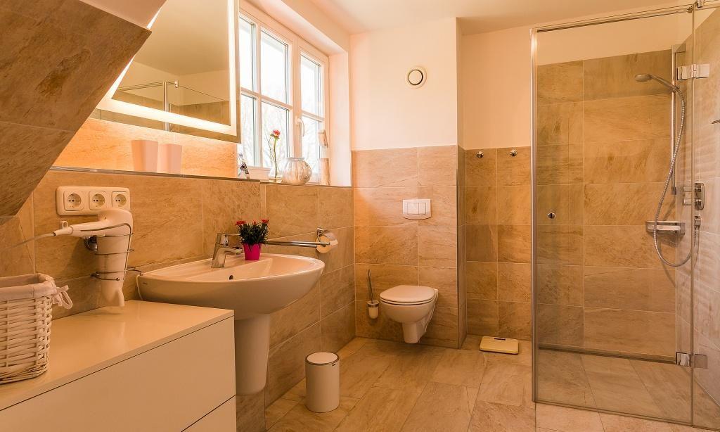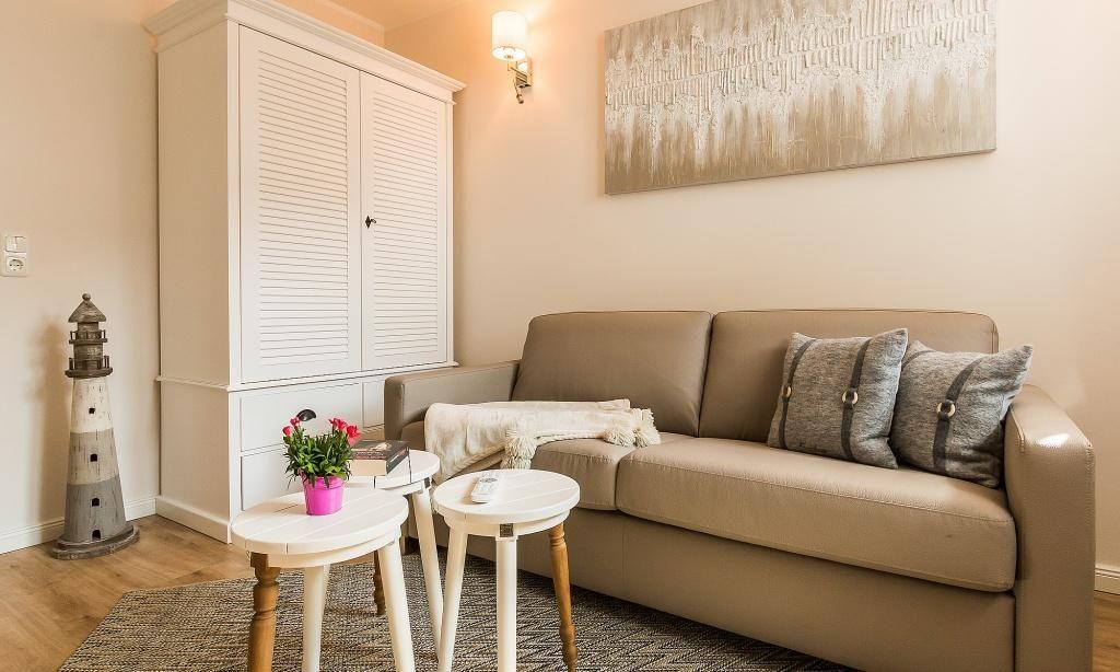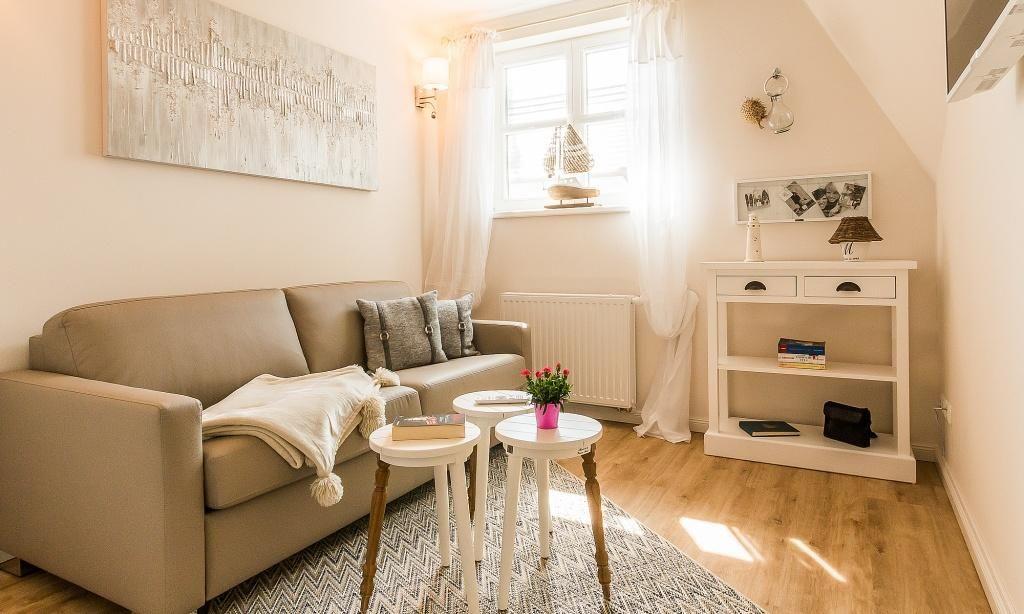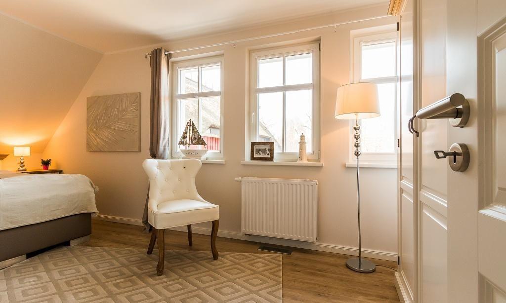 Im Erdgeschoss erwartet dich ein freundlicher, lichtdurchfluteter Wohnraum mit einer gemütlichen Sitzecke am Kaminofen. Die voll ausgestattete Küche und der Essbereich fügen sich unmittelbar in den Raum ein und schaffen einen offenen Wohncharakter. Es schließt sich das Bad mit Dusche/WC und Fußbodenheizung an. Das Obergeschoss beherbergt ein Schlafzimmer, das mit einem Boxspringbett von 1,60 m Breite ausgestattet ist. Auf dem Boxspringbett befindet sich ein durchgehender Topper (für ein großes Laken). Ein zusätzliches Gästezimmer birgt die Möglichkeit, mit einem Schlafsofa für bis zu zwei Personen aufzubetten. Ein zweites Bad mit Dusche/WC und Fußbodenheizung sowie eine integrierten Sauna sorgen für noch mehr Wohlfühl-Komfort.