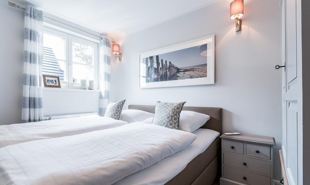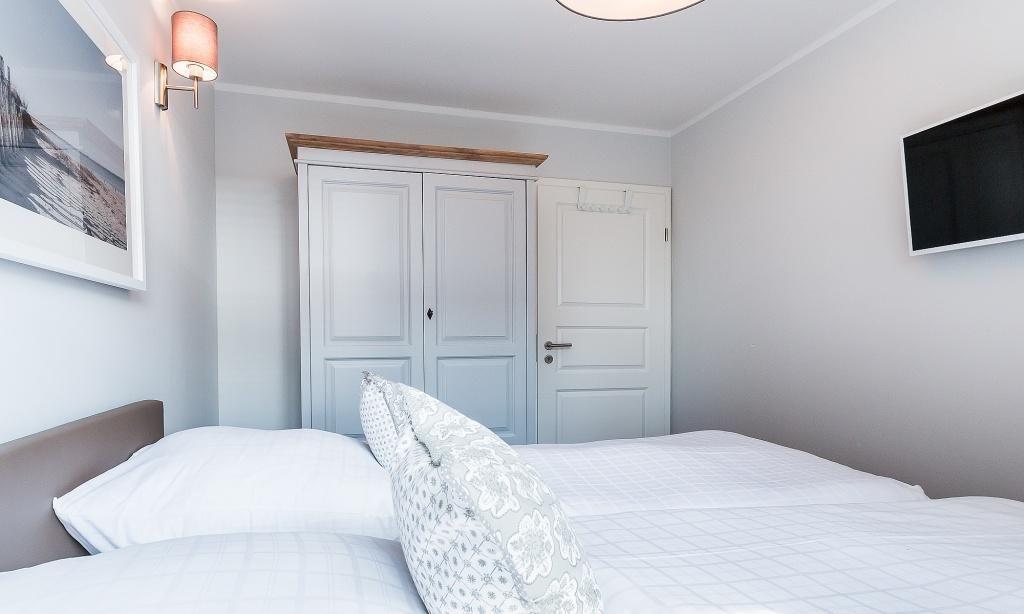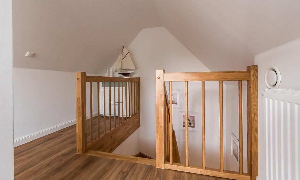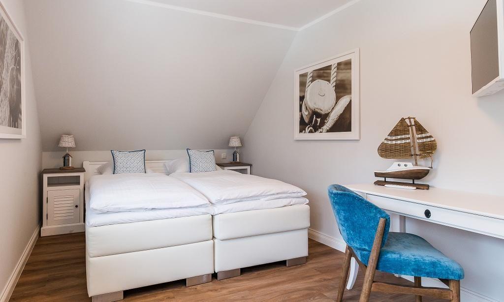 Im Dachgeschoss befindet sich ein drittes Schlafzimmer mit zwei Einzelbetten als zusätzliches Kinderzimmer oder Rückzugsort. Von hier hast du einen kleinen Boddenblick.
