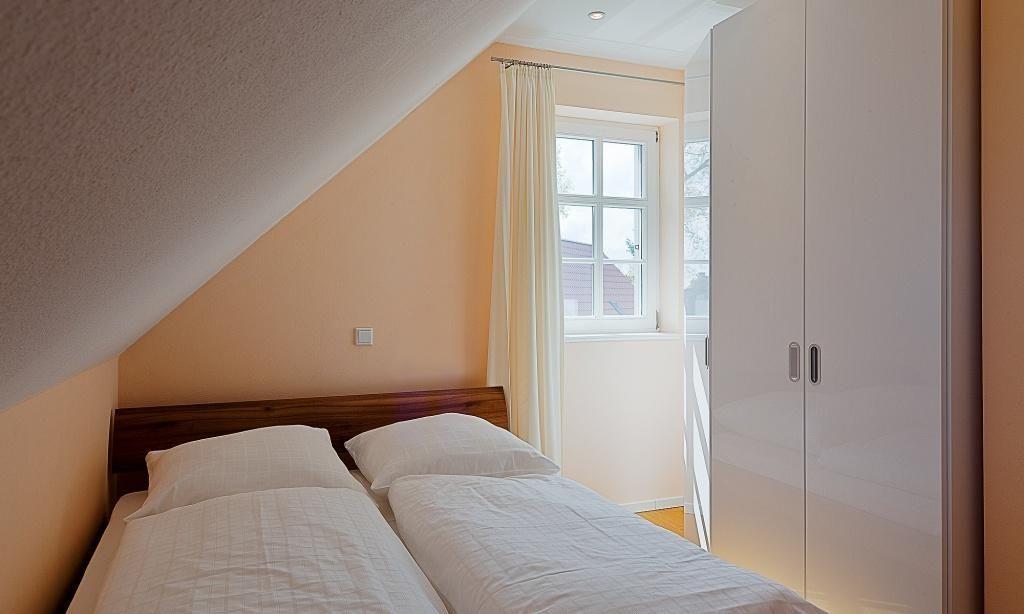 Im Erdgeschoss der Haushälfte befinden sich der helle und freundliche Wohnraum mit einladender Sitzecke am Kaminofen, eine offene Küchenzeile mit Esstisch sowie das Gäste-WC und der Zugang zur Terrasse. Im Obergeschoss erwarten dich zwei gemütlich eingerichtete Schlafzimmer mit jeweils einem Doppelbett und ein Bad mit Dusche/WC.