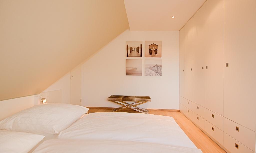 Du gelangst über den abgeschlossenen Eingangsbereich mit Garderobe direkt in den offenen und lichtdurchfluteten Wohnbereich. Hier erwartet dich eine gemütliche Sitzecke am modernen Kamin. Ein großzügiger Essbereich und die hochwertige Einbauküche mit Kochinsel und Tresen sind perfekt aufeinander abgestimmt und fügen sich harmonisch in das Gesamtbild ein. Auch ein Gästebad mit Dusche/WC befindet sich im Erdgeschoss. Das Obergeschoss beherbergt ein Schlafzimmer mit einem Doppelbett sowie ein luxuriöses Bad mit Badewanne, Dusche/WC. Der Spitzboden bietet ein zusätzliches Geschoss, das als offene Schlafgalerie mit zwei Einzelbetten ausgestattet ist. Im Anbau des Hauses wurde eine Wellnessoase geschaffen, die sich über zwei Ebenen erstreckt und von beiden Haushälften genutzt werden kann. Dank der Sauna, Dusche und dem Ruhebereich mit Entspannungsliegen kannst du hier nach Herzenslust relaxen, neue Energie tanken und einfach nur die Seele baumeln lassen.