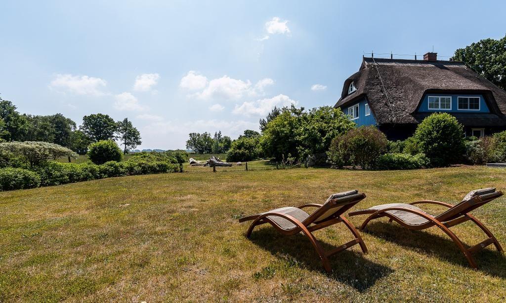 Vom Wohnbereich gelangst du auf die großzügige Holzterrasse. Hier genießt du neben der hochwertigen Bestuhlung mit Sonnenschirm einen traumhaften Blick auf die weite Wiesenlandschaft. Sonnenliegen können ebenso wie der Garten mit genutzt werden. Es steht ein PKW-Stellplatz zur Verfügung.