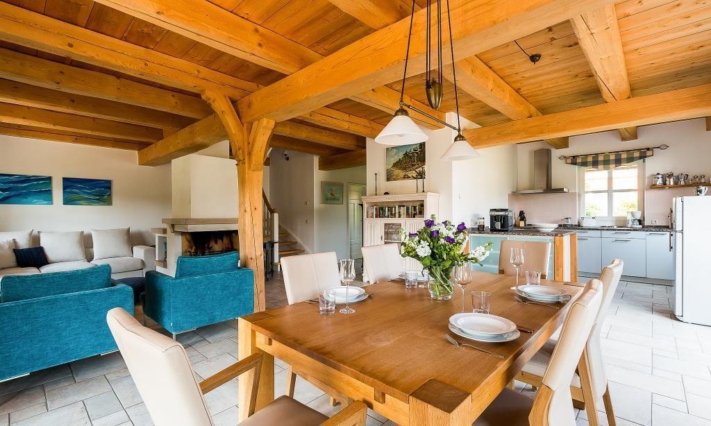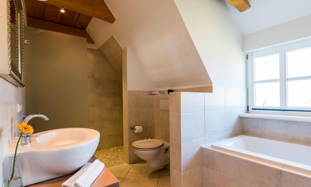 Im Erdgeschoss erwartet dich ein großzügiger und sonnendurchfluteter Wohnbereich, der mit seiner Holzständerbauweise und offenem Fachwerk für besondere Wohnatmosphäre sorgt. Mit seiner großzügigen Sofalandschaft, der offenen Küche und dem geselligen Essbereich wird der Wohnbereich schnell zum Mittelpunkt des Hauses. Weiterhin befinden sich im Erdgeschoss ein Bad mit Dusche/WC sowie ein Hauswirtschaftsraum. Über eine wunderschöne Echtholztreppe gelangst du ins Obergeschoss. Hier befinden sich die drei Schlafzimmer, wovon zwei mit einem Doppelbett und eins mit einem Einzelbett ausgestattet sind. Ein großes Bad mit Badewanne und Dusche/WC liegt ebenfalls auf dieser Etage. Der Spitzboden birgt ein weiteres Highlight. Denn hier erwartet dich ein exklusiver Wellnessbereich mit Sauna, einer großflächigen Dusche und zwei Ruheliegen. Ankommen und sofort Urlaubs-Feeling spüren - das geht mit diesem wundervollen Ferienhaus unter Reet.