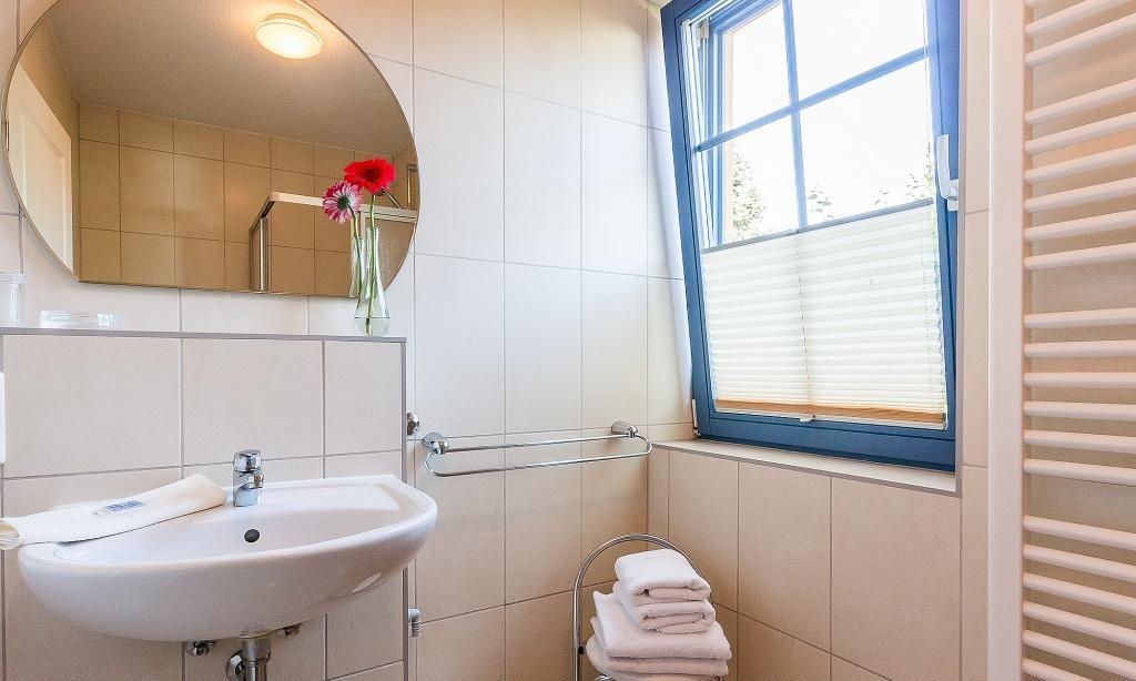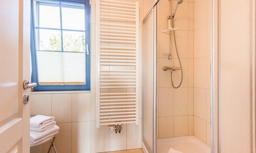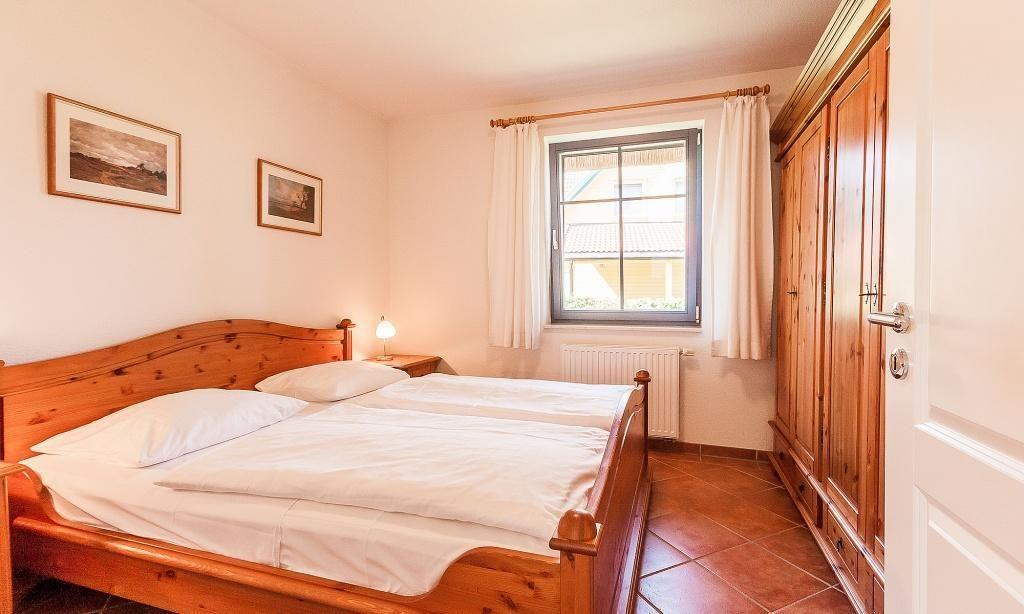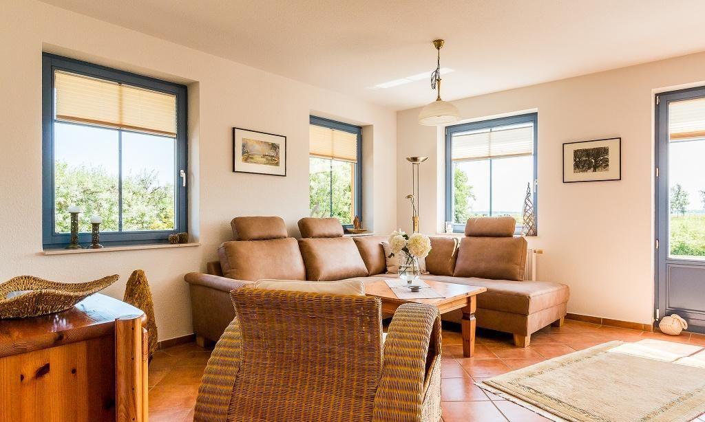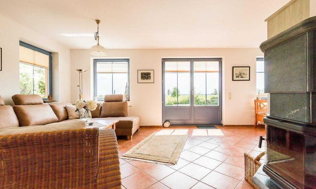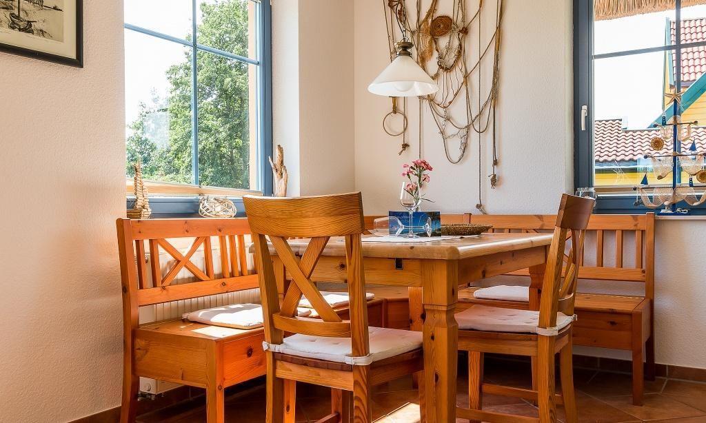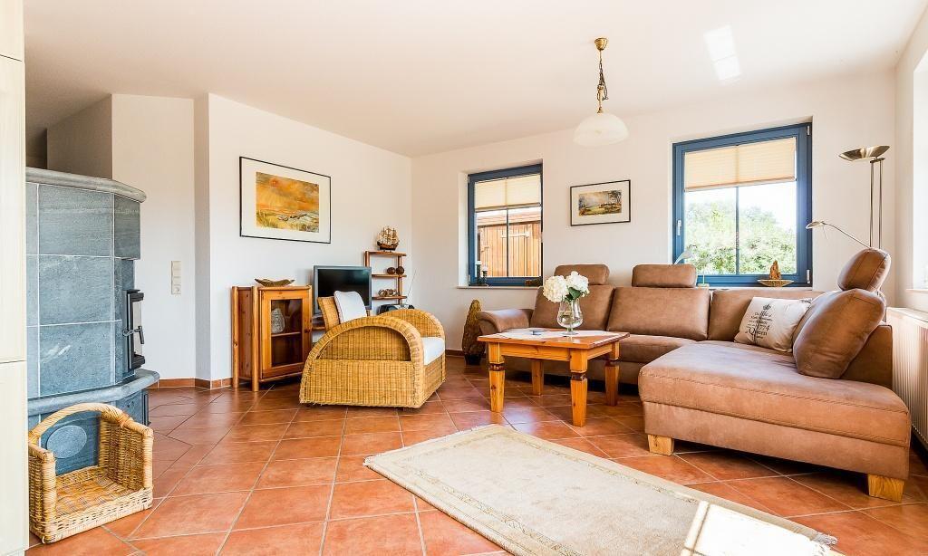 Die Erdgeschosswohnung begeistert mit einem lichtdurchfluteten und großzügigen Wohn- und Küchenbereich. Freue dich auf Annehmlichkeiten wie dem gemütlichen Ecksofa, TV und Kaminofen, der zu jeder Jahreszeit heimelige Wärme spendet. Die voll ausgestattet Küchenzeile ist in den Wohnbereich integriert. Zusammen mit der Eckbank und dem Essplatz kannst du hier gesellig kochen, essen und klönen. Die beiden Schlafzimmer im rustikalen Landhausstil sind mit einem bequemen Doppelbett und einem Schrank für viel Stauraum ausgestattet. Zusammen mit dem Tageslichtbad mit Dusche/WC bietet diese Ferienwohnung alles für einen erholsamen Urlaub für bis zu vier Personen.