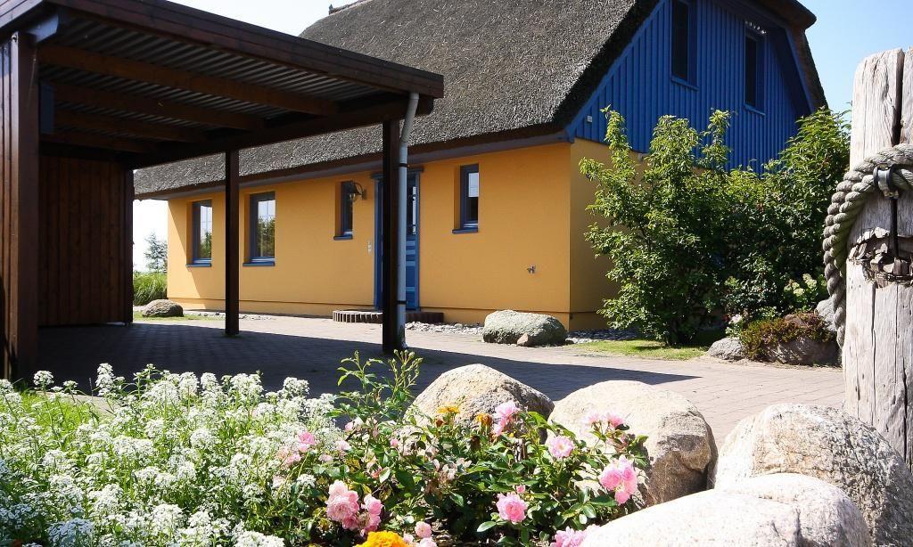 Im Außenbereich erwartet dich eine große Steinterrasse mit herrlichem Blick in den Garten und die angrenzende Boddenlandschaft. Hier kannst du den Tag bei einem sonnigen Frühstück beginnen oder am Abend gemütlich ausklingen lassen. Dank der idyllischen Lage findest du hier die Ruhe und Erholung, die du dir im Urlaub wünschst. Ein abschließbarer Fahrradschuppen und ein PKW-Stellplatz im Carport gehören zur Ferienwohnung dazu.