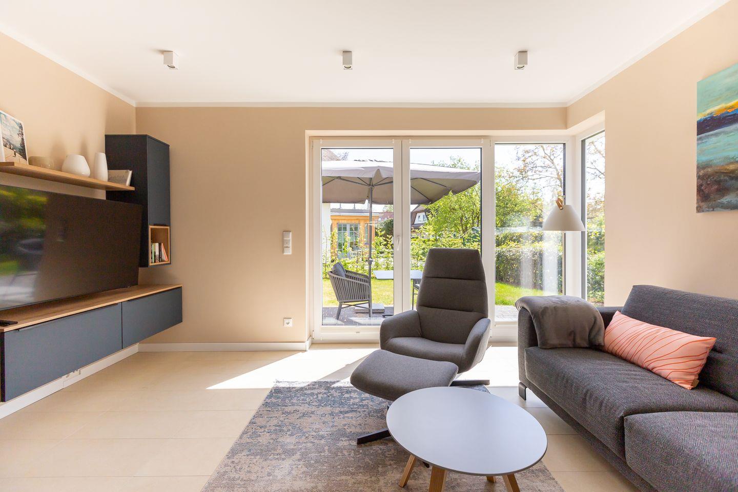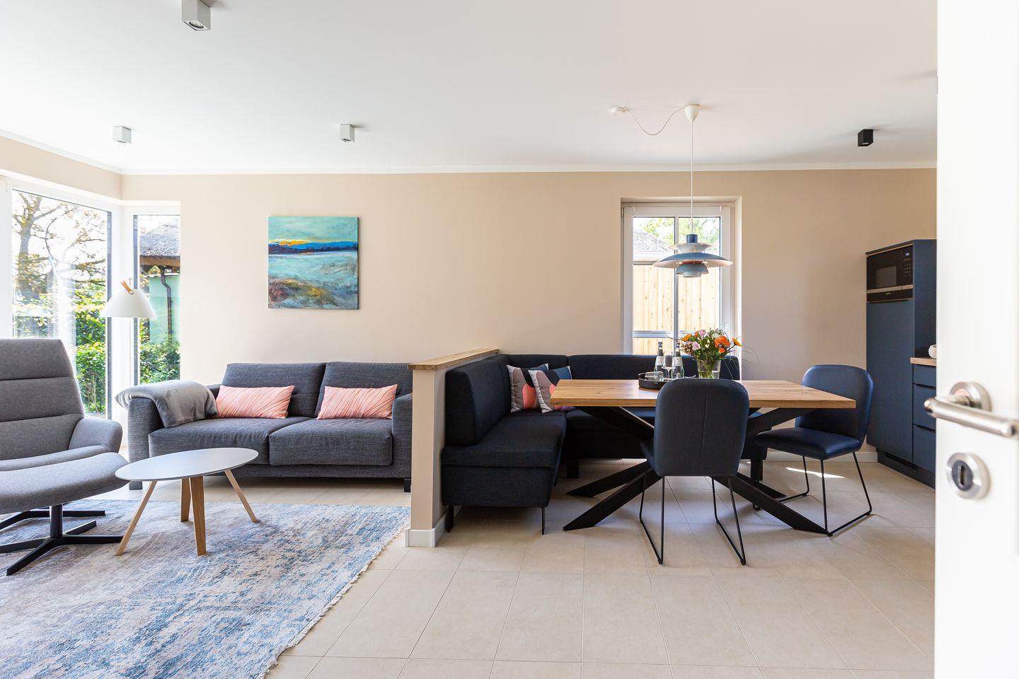 Schon bei Eintritt sieht man, was dieses wundervolle Ferienhaus auszeichnet. Klare Linien, hochwertige Materialien und helle Farben. Damit führt sich das Thema Design, das durch die besondere Architektur bereits außen erkennbar ist, auch im Innenbereich fort. Der großzügig gestaltete Wohn- und Küchenbereich ist das Herzstück des Hauses. Die schlichte Formsprache und zurückhaltende Dekoration schaffen ein modernes und zeitloses Wohngefühl, was zu keiner Zeit Ungemütlich wirkt. Ganz im Gegenteil, so sorgen der Kamin, das Sofa und der Relaxsessel an bodentiefen Fenstern für eine angenehme Behaglichkeit.