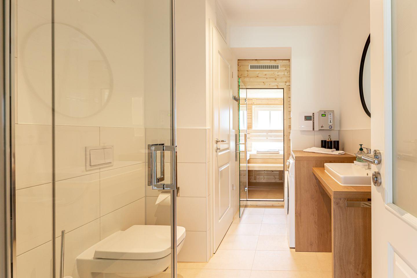 Über die Treppe gelangt man ins Obergeschoss und den Schlafbereich. Beide Schlafzimmer verfügen über ein hochwertiges Boxspringbett, einen Kleiderschrank, Ablagefläche und TV. Unaufgeregte Farben und kleine Akzente, wie die dekorativen Kraniche und Kissen sorgen für Stil und Gemütlichkeit, lenken aber nicht von der erholsamen Ruhezone ab. Ein zweites modernes Tageslichtbad mit Dusche und Badewanne macht den Wohnkomfort perfekt.