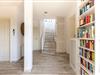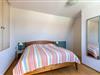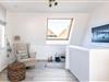 Über die Treppe gelangt man in das Obergeschoss und in das dritte Schlafzimmer. Der Wohnbereich befindet sich im Spitzdach und ist zweifelsohne das Highlight des Ferienhauses. Das lichtdurchflutete und in hellen Farben eingerichtete Wohnzimmer bietet bereits einen spektakulären Blick auf den Bodden. Noch beeindruckender ist dieser auf der angrenzenden Dachterrasse. Egal, ob im Strandkorb oder am großen Tisch – hier möchte man einfach nur sein! Denn nichts lässt einen mehr im Urlaub ankommen, als der weite Blick auf das Wasser, dass in der Sonne glitzert, eingerahmt von einer malerischen Landschaft. Wir übertreiben nicht, wenn wir sagen, dass es nicht viele Ferienhäuser in Wieck mit so einer besonderen Aussicht gibt.