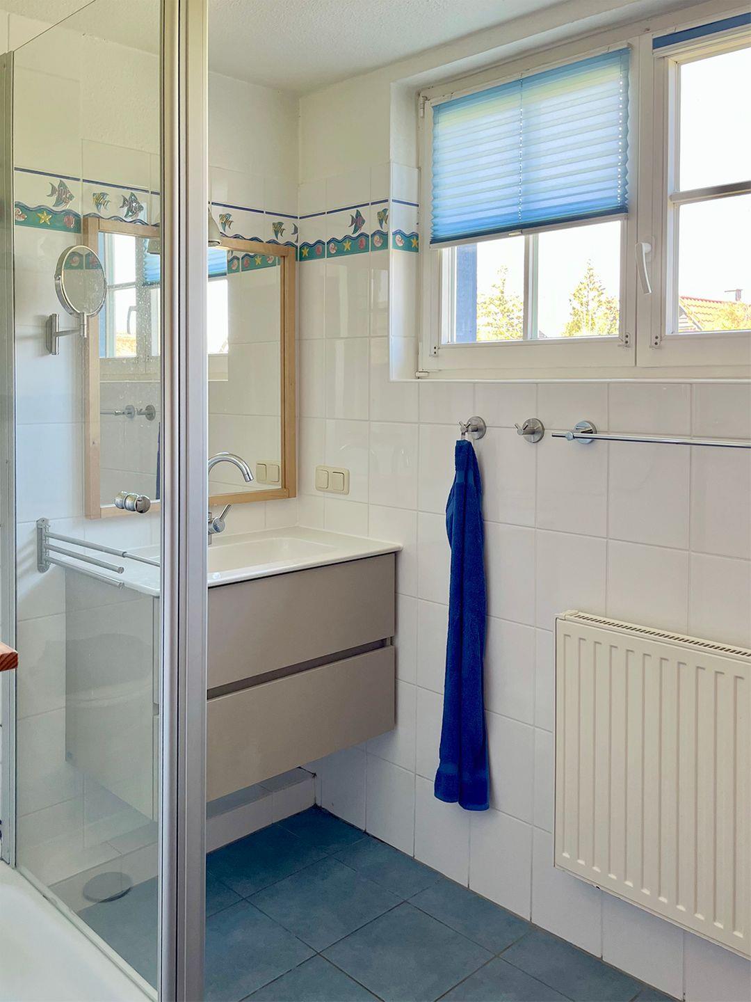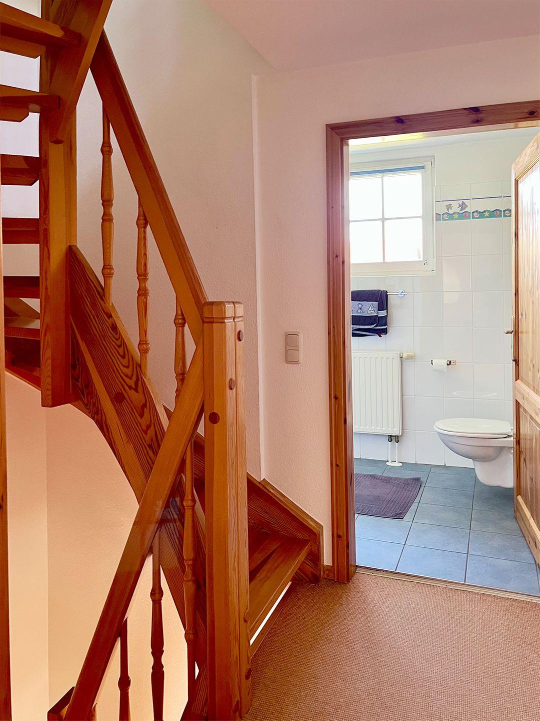 Im Obergeschoss befinden sich zwei Schlafzimmer: Eines mit einem komfortablen Doppelbett (180 x 200 cm) und das andere mit zwei Einzelbetten (90 x 200 cm). Ein Tageslicht-Duschbad mit WC rundet das Angebot im Obergeschoss ab.