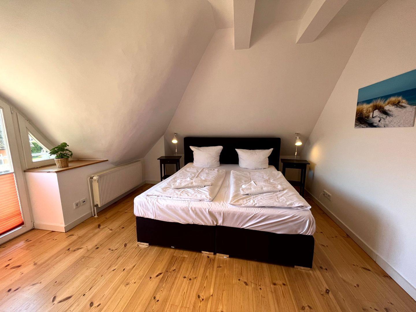einem Doppelbett (je 180x200cm, Matratze durchgängig) und das Badezimmer, mit