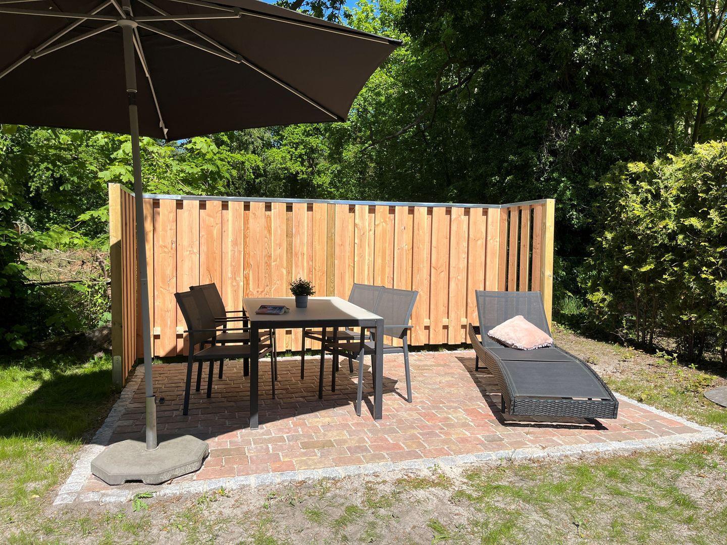 Gartenmöbeln und Sonnenschirm und einer Gartenliege ausgestattet. Der Bereich