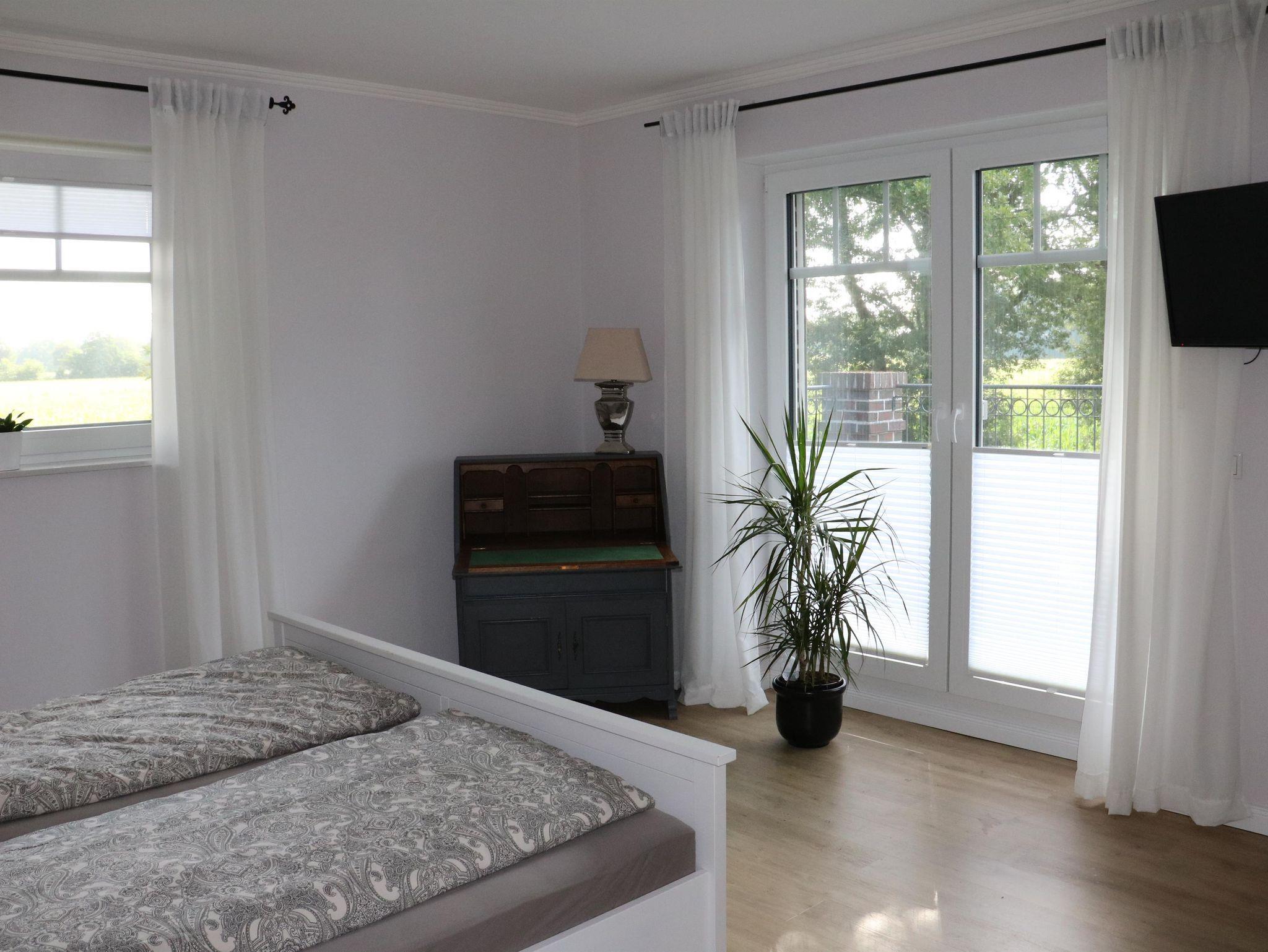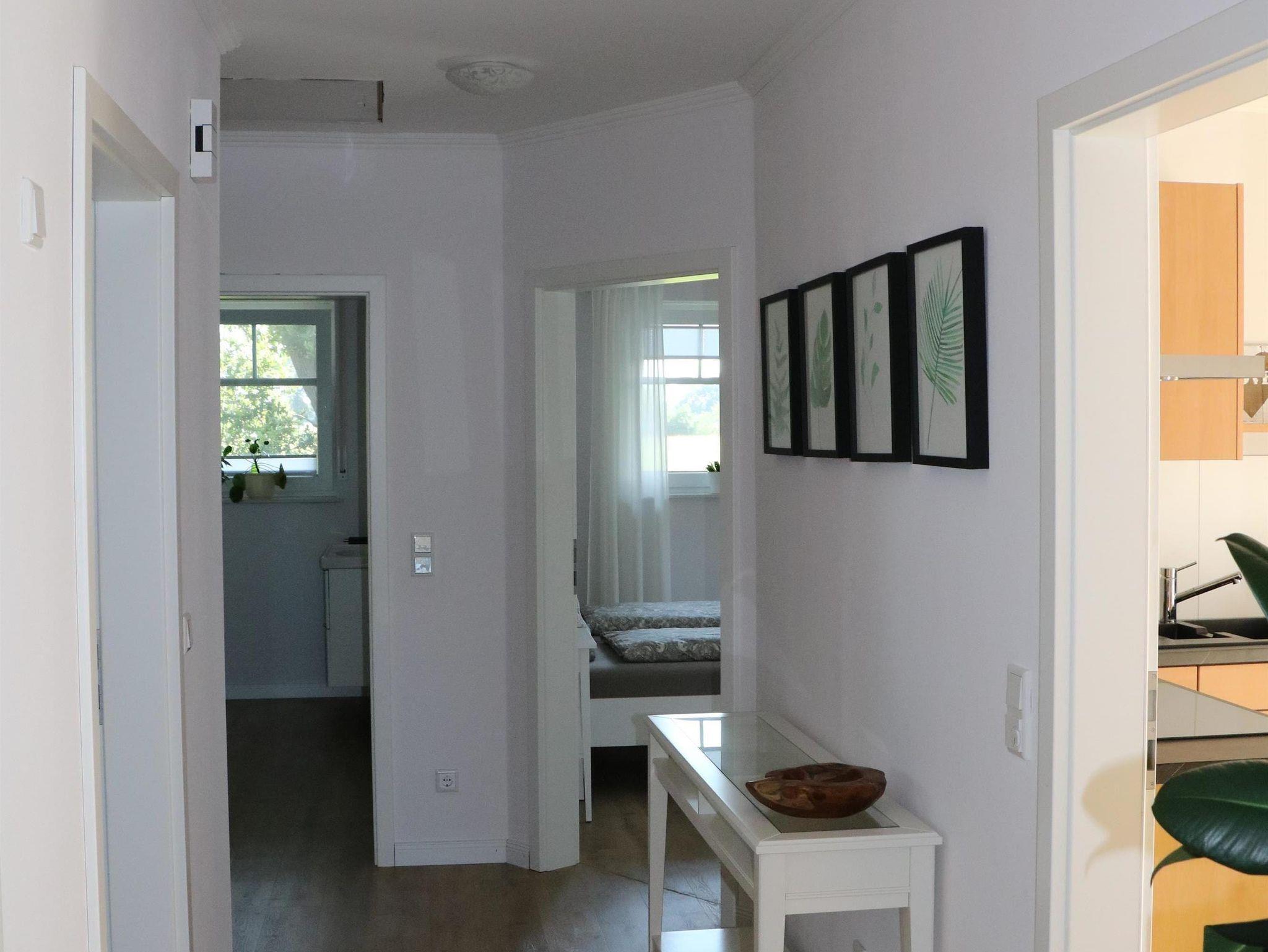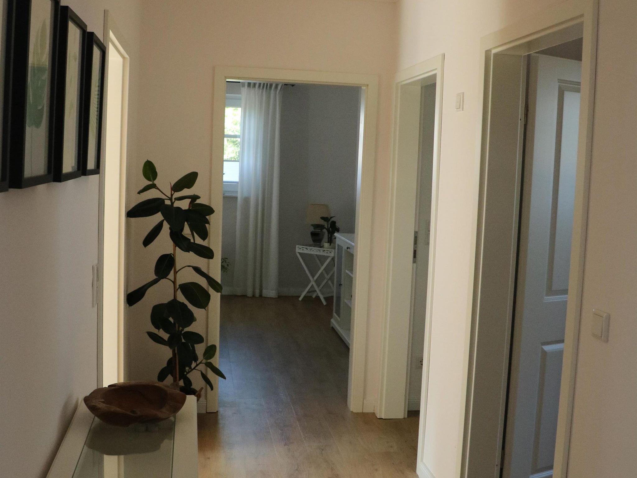 Die Ferienwohnung mit separatem Eingang wurde im Sommer 2022 neu eingerichtet und eröffnet. Sie erstreckt sich über das gesamte Obergeschoss des Zweifamilienhauses. Vom Treppenhaus gelangen Sie in den Flur und von dort aus in alle Zimmer. Seit 01.11.2025 verfügt die Wohnung über einen Anschluss an das Glasfasernetz.