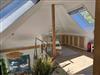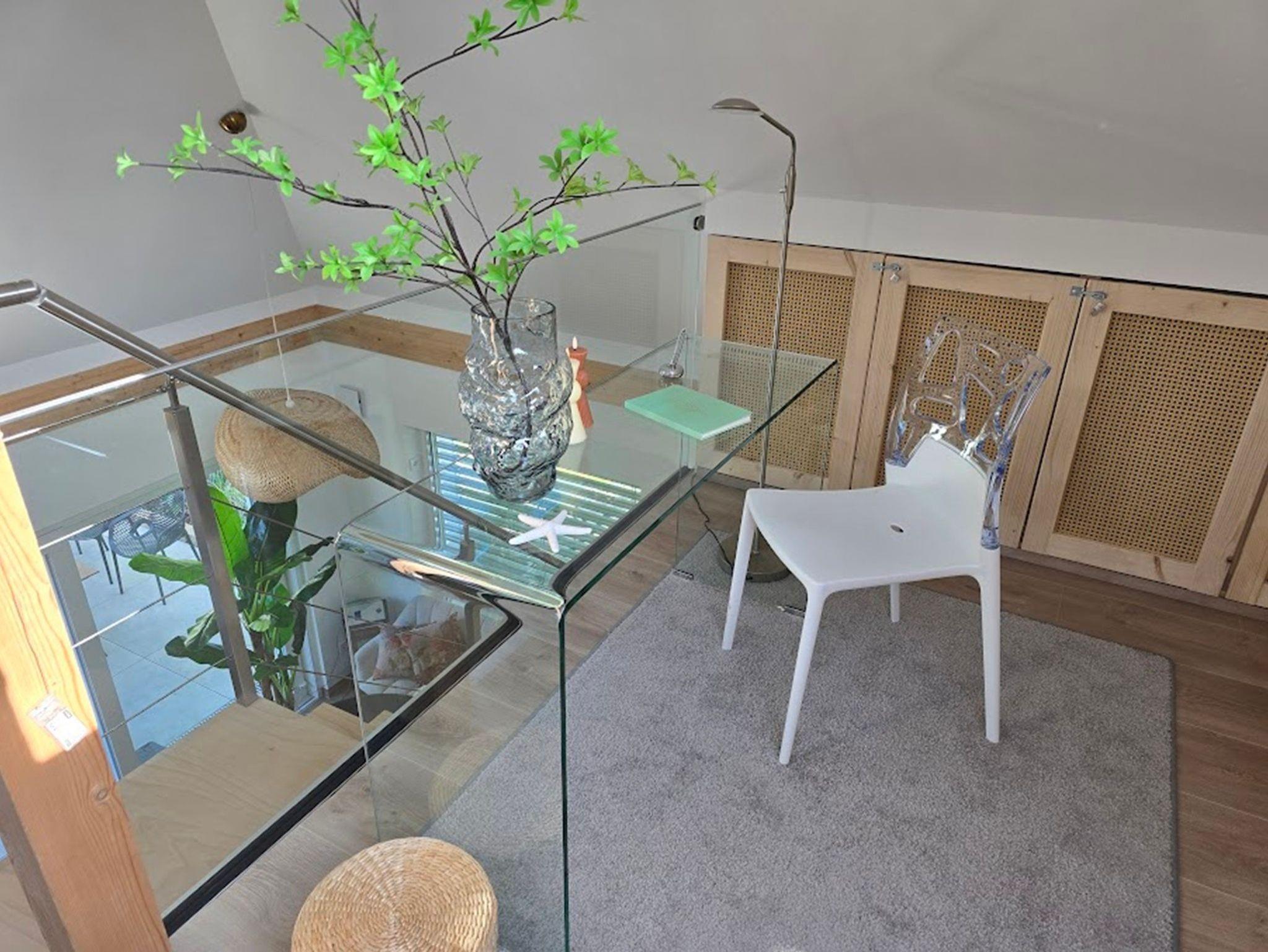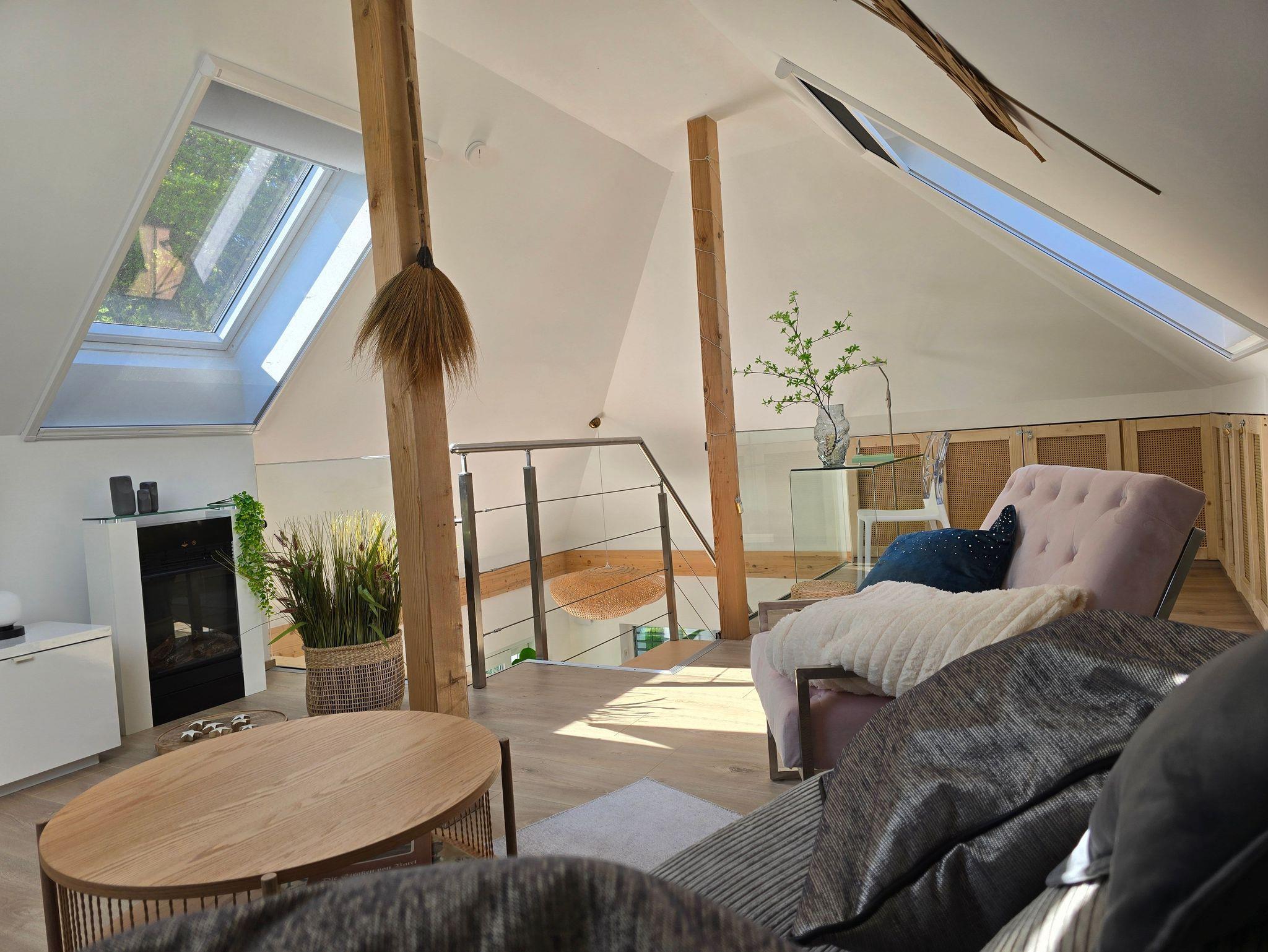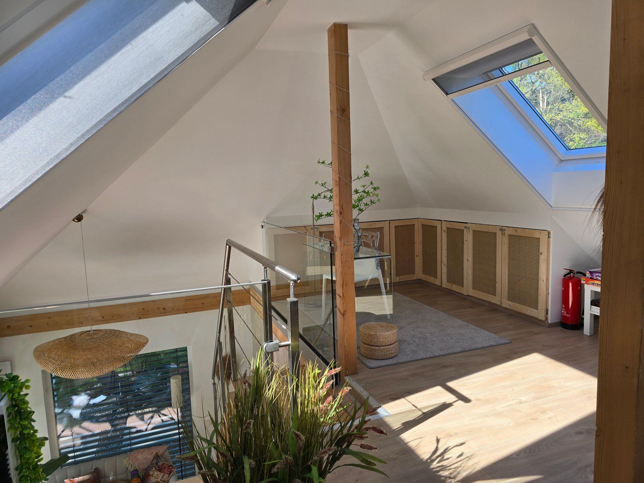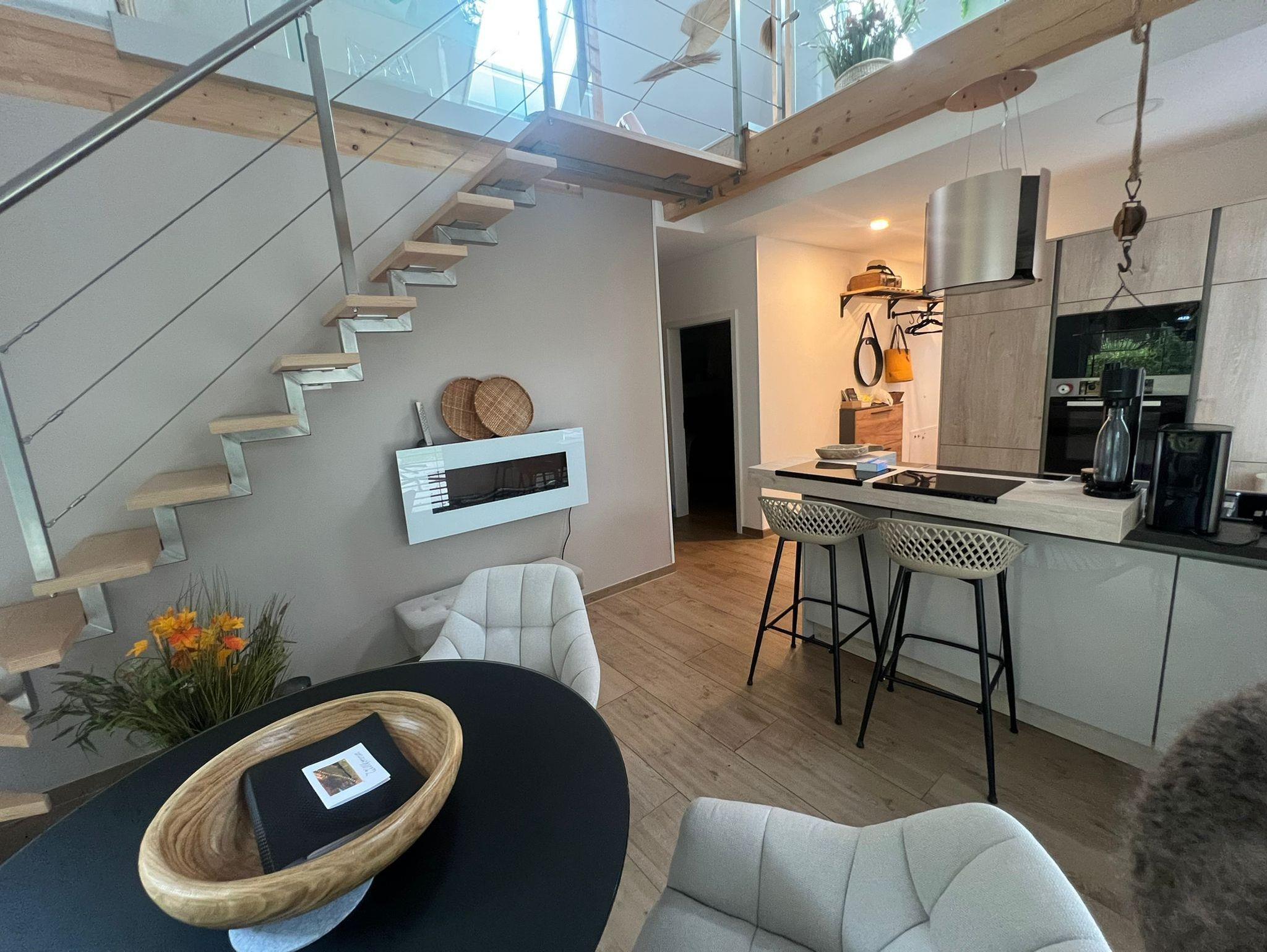 Eine offene Holztreppe führt im Essbereich hinauf in die ansprechende Maisonette-Ebene mit Relaxmöbeln, TV und einem modernen Arbeitsplatz mit Glasschreibtisch. Auch hier erhöht ein Elektrokamin optisch die Gemütlichkeit. Spiele und Lesematerial sorgen für angenehmen Zeitvertreib.